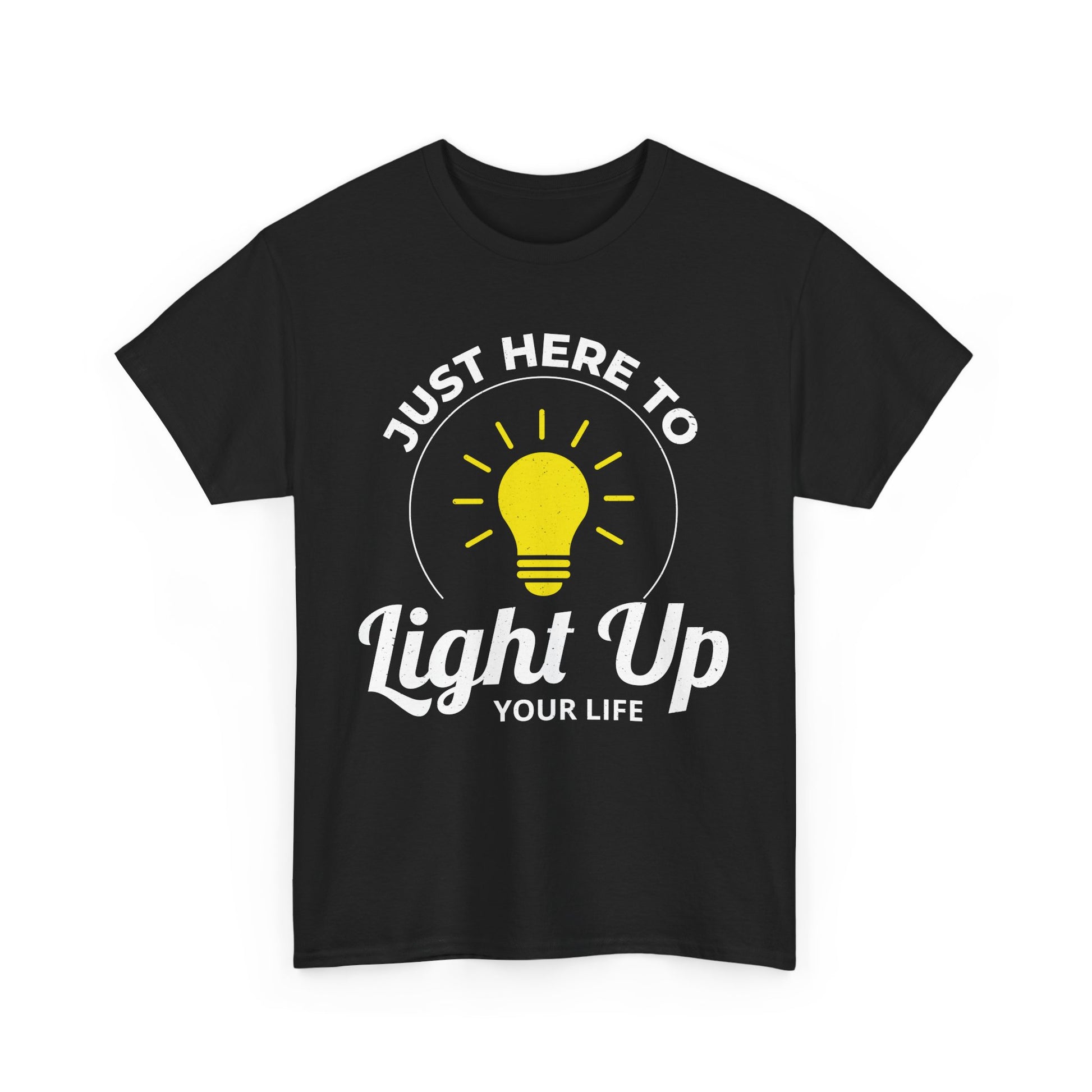 Ein stylisches Elektriker-T-Shirt mit einer hellen Glühbirne und dem Spruch „Just Here to Light Up Your Life“. Perfekt für Elektriker und Elektromonteure.
