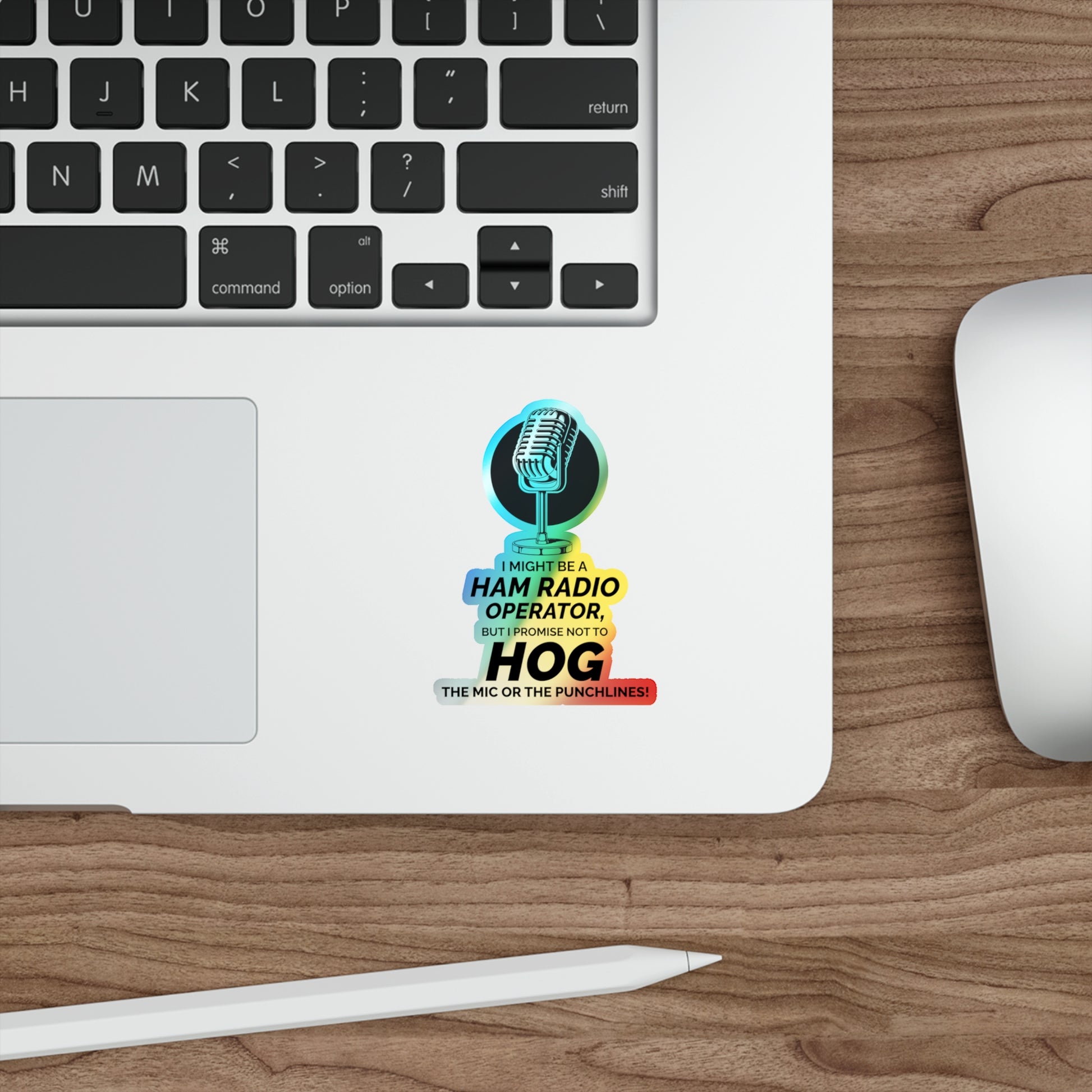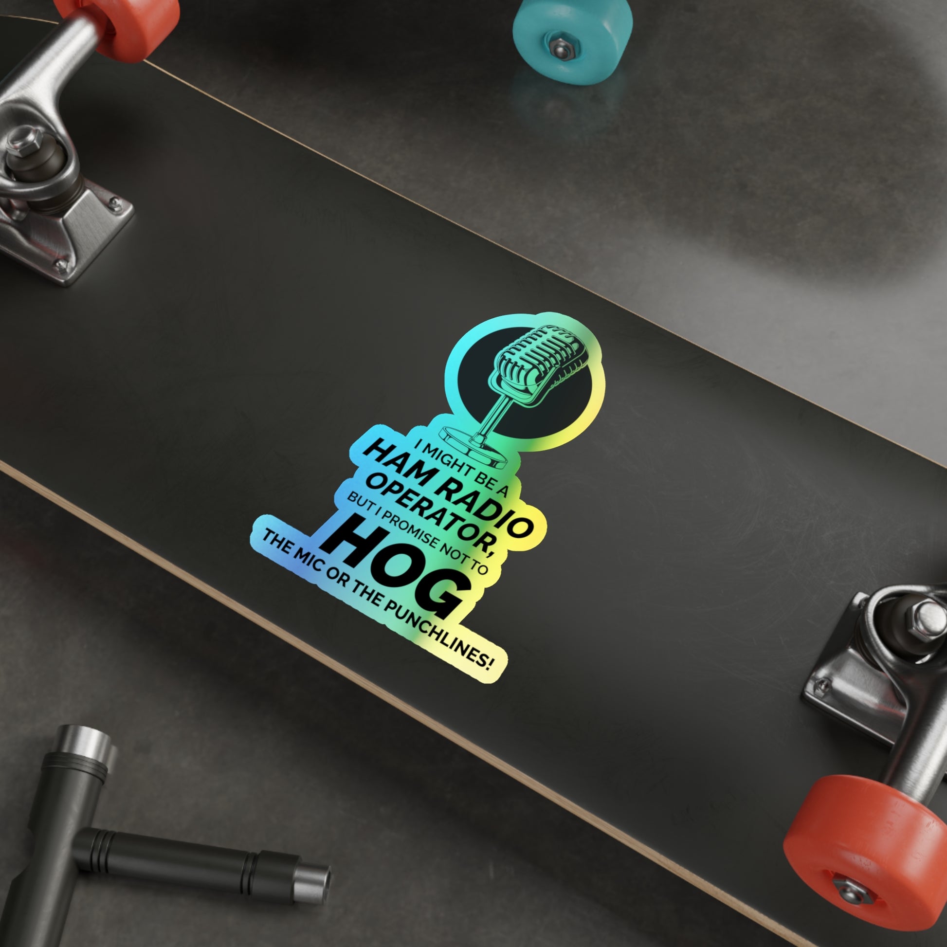 Show off your thoughtful operator style with this humorous holographic decal! Perfect for hams who value good QSO etiquette as much as their punchlines, this sticker promises you won't monopolize the mic or the jokes. Great for your radio gear, shack, or laptop to display your balanced approach to amateur radio.