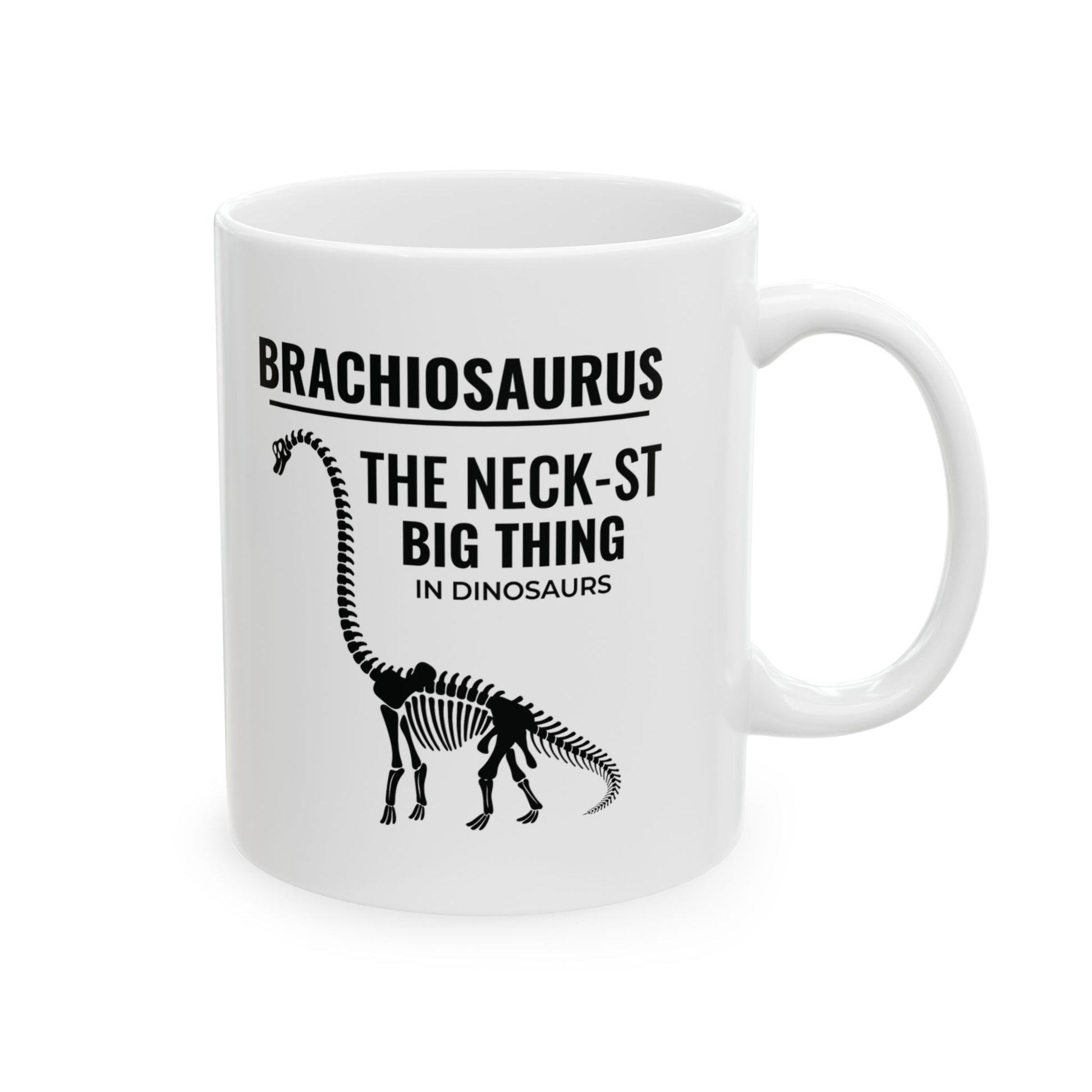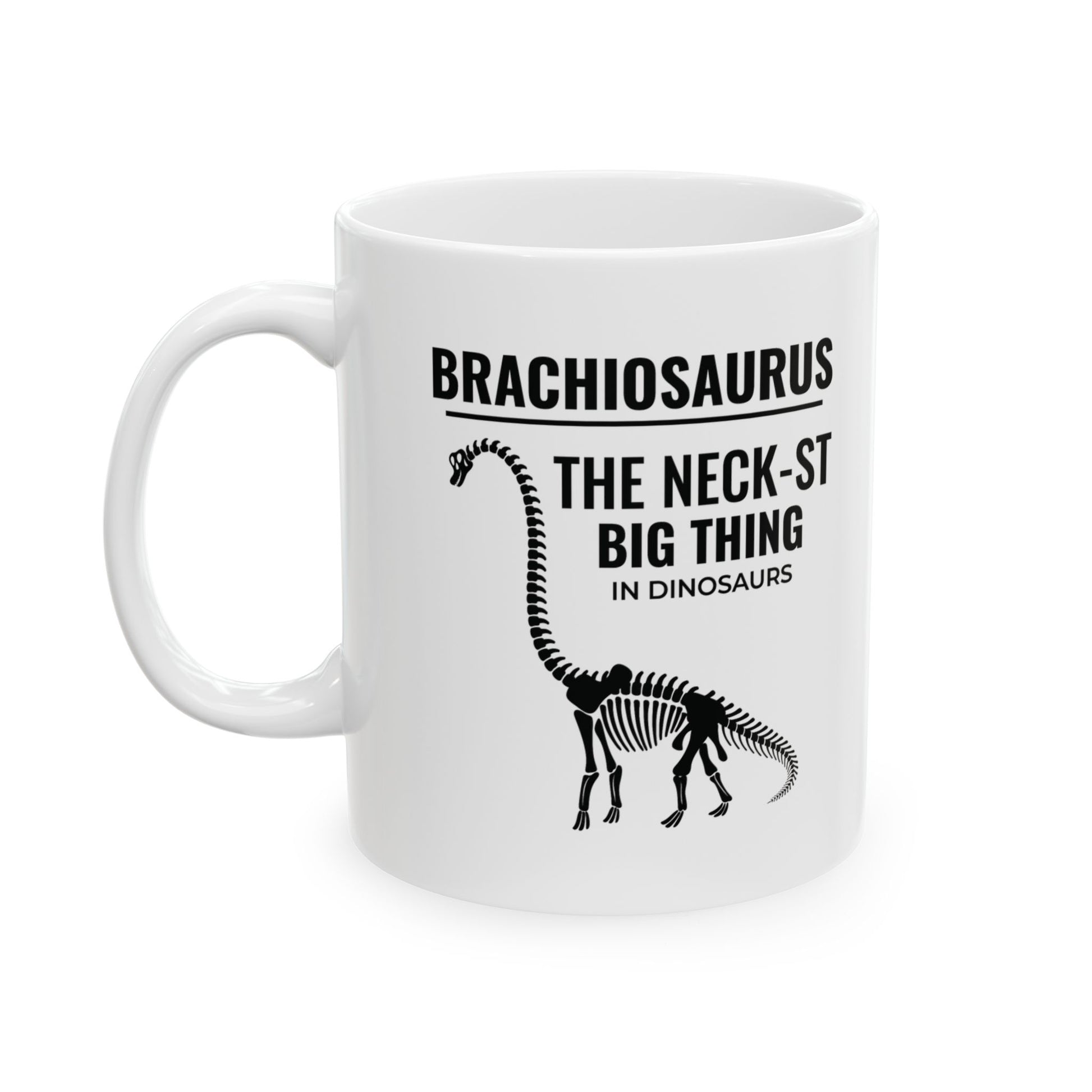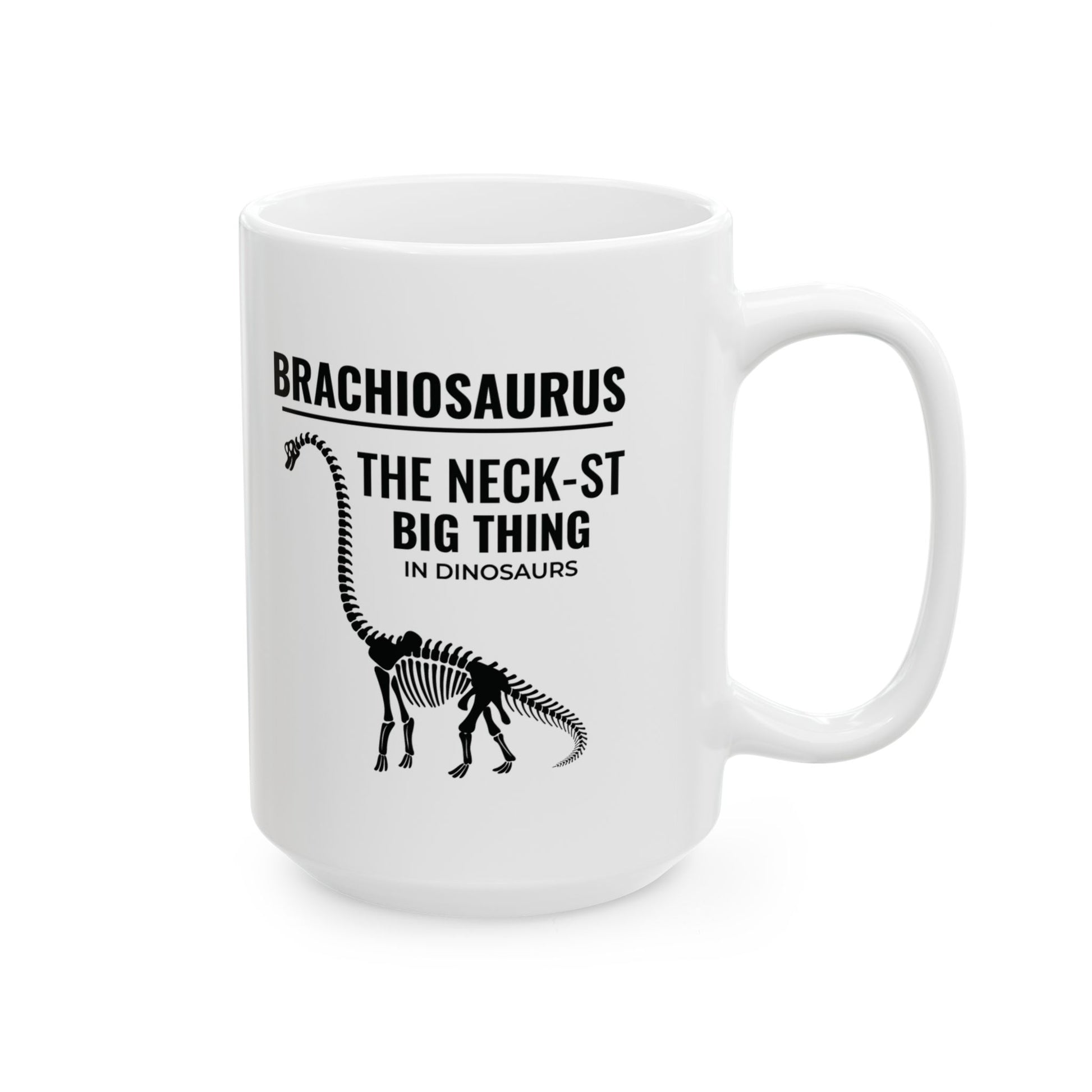 Step into the world of giants with our Brachiosaurus Dinosaur Fossil Mug, featuring the iconic "The Neck-st Big Thing" design. This mug is perfect for dinosaur enthusiasts and fossil collectors who admire the grandeur of the Brachiosaurus. Bring a touch of prehistoric wonder to your daily coffee or tea ritual with this beautifully crafted mug. Warm-up with a nice cuppa out of this customized ceramic coffee mug. It’s BPA and Lead-free, microwave & dishwasher-safe, and made of white, durable ceramic in 11-ounce and 15-ounce sizes. Thanks to the advanced printing tech, your designs come to life with incredibly vivid colors – the perfect gift for coffee, tea, and chocolate lovers. .: These mugs are made with durable white ceramic so that your prints can stand out. .: Available in two sizes: 11oz (0.33 l) and 15oz (0.44 l) .: All mugs feature a comfortable C-handle and a shiny finish so that they're both easy to use and great to look at. .: Drink confidently on a daily basis as all mugs are lead and BPA-free.