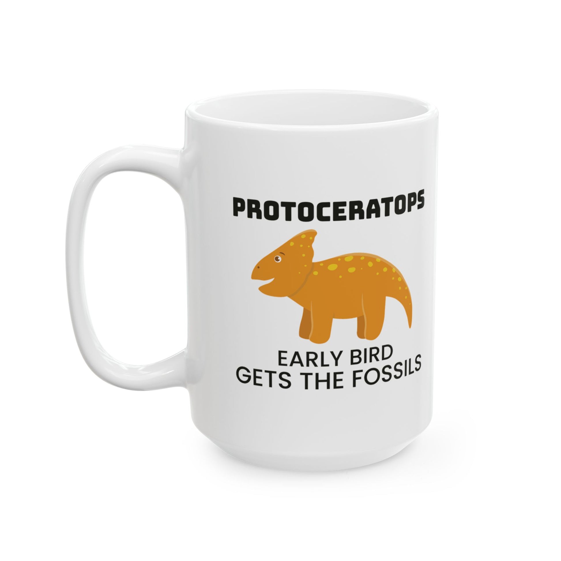 "Early Bird Gets the Fossils!" Start your day with a prehistoric chuckle with this Protoceratops Dinosaur Fossil Mug. Featuring a charming illustration of the Protoceratops, a small horned dinosaur, this mug adds a touch of humor to your morning routine. The playful quote makes it a perfect gift for any dinosaur enthusiast with a love for puns and a passion for paleontology. Enjoy your favorite beverage with a dash of ancient wit and a whole lot of Protoceratops charm! Warm-up with a nice cuppa out of this customized ceramic coffee mug. It’s BPA and Lead-free, microwave & dishwasher-safe, and made of white, durable ceramic in 11-ounce and 15-ounce sizes. Thanks to the advanced printing tech, your designs come to life with incredibly vivid colors – the perfect gift for coffee, tea, and chocolate lovers. .: These mugs are made with durable white ceramic so that your prints can stand out. .: Available in two sizes: 11oz (0.33 l) and 15oz (0.44 l) .: All mugs feature a comfortable C-handle and a shiny finish so that they're both easy to use and great to look at. .: Drink confidently on a daily basis as all mugs are lead and BPA-free.