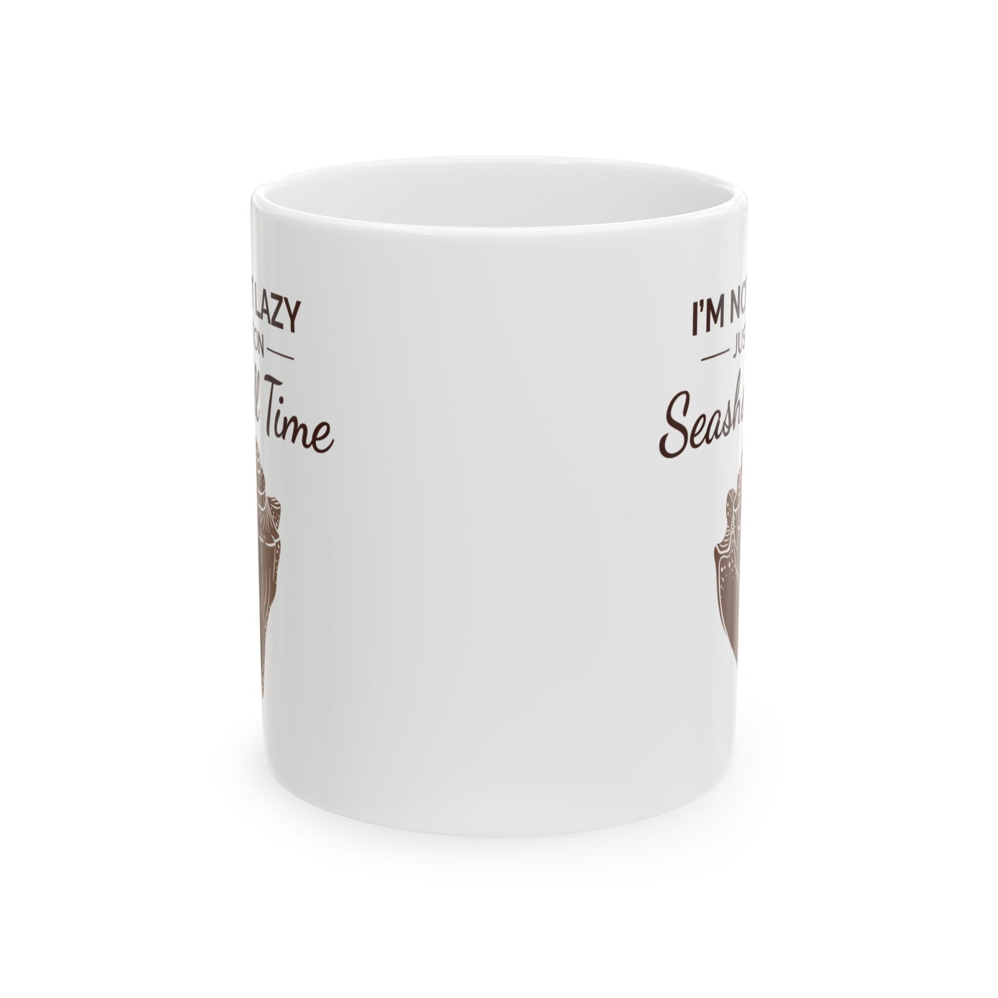 Embrace the relaxed pace of beach life with this "I'm Not Lazy - Just on Seashell Time" mug. Perfect for beach lovers and seashell enthusiasts, this mug features a detailed conch shell illustration and a humorous message. Enjoy your favorite beverage and let everyone know you're operating on "seashell time." Warm-up with a nice cuppa out of this customized ceramic coffee mug. It’s BPA and Lead-free, microwave & dishwasher-safe, and made of white, durable ceramic in 11-ounce and 15-ounce sizes. Thanks to the advanced printing tech, your designs come to life with incredibly vivid colors – the perfect gift for coffee, tea, and chocolate lovers. .: These mugs are made with durable white ceramic so that your prints can stand out. .: Available in two sizes: 11oz (0.33 l) and 15oz (0.44 l) .: All mugs feature a comfortable C-handle and a shiny finish so that they're both easy to use and great to look at. .: Drink confidently on a daily basis as all mugs are lead and BPA-free.