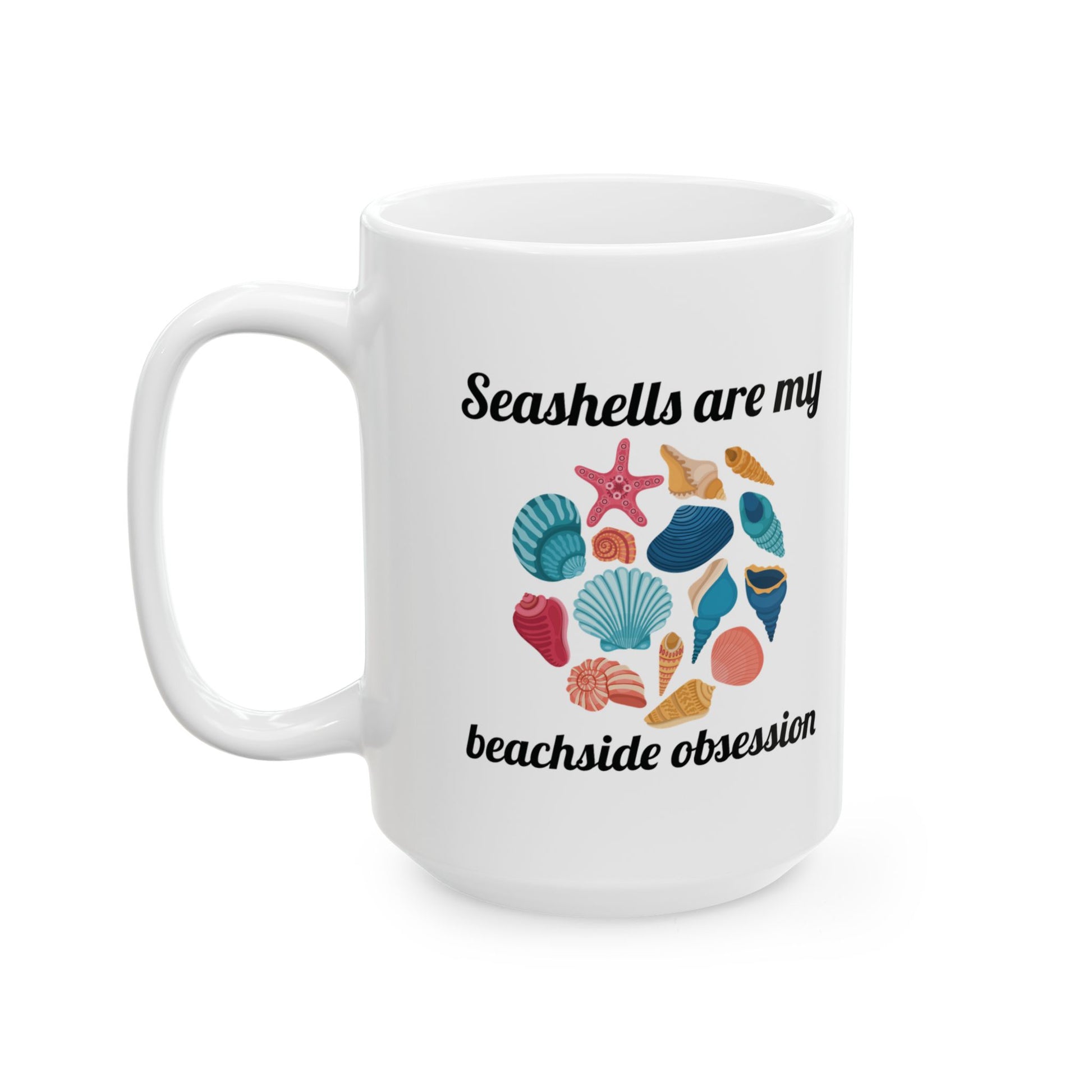 Declare your love for the shore with this "Seashells are my beachside obsession" mug. Perfect for seashell enthusiasts and beachcombers, this mug features a vibrant collection of seashells and starfish, capturing the joy of finding treasures by the sea. Enjoy your favorite beverage and celebrate your passion for the ocean's wonders. Warm-up with a nice cuppa out of this customized ceramic coffee mug. It’s BPA and Lead-free, microwave & dishwasher-safe, and made of white, durable ceramic in 11-ounce and 15-ounce sizes. Thanks to the advanced printing tech, your designs come to life with incredibly vivid colors – the perfect gift for coffee, tea, and chocolate lovers. .: These mugs are made with durable white ceramic so that your prints can stand out. .: Available in two sizes: 11oz (0.33 l) and 15oz (0.44 l) .: All mugs feature a comfortable C-handle and a shiny finish so that they're both easy to use and great to look at. .: Drink confidently on a daily basis as all mugs are lead and BPA-free.