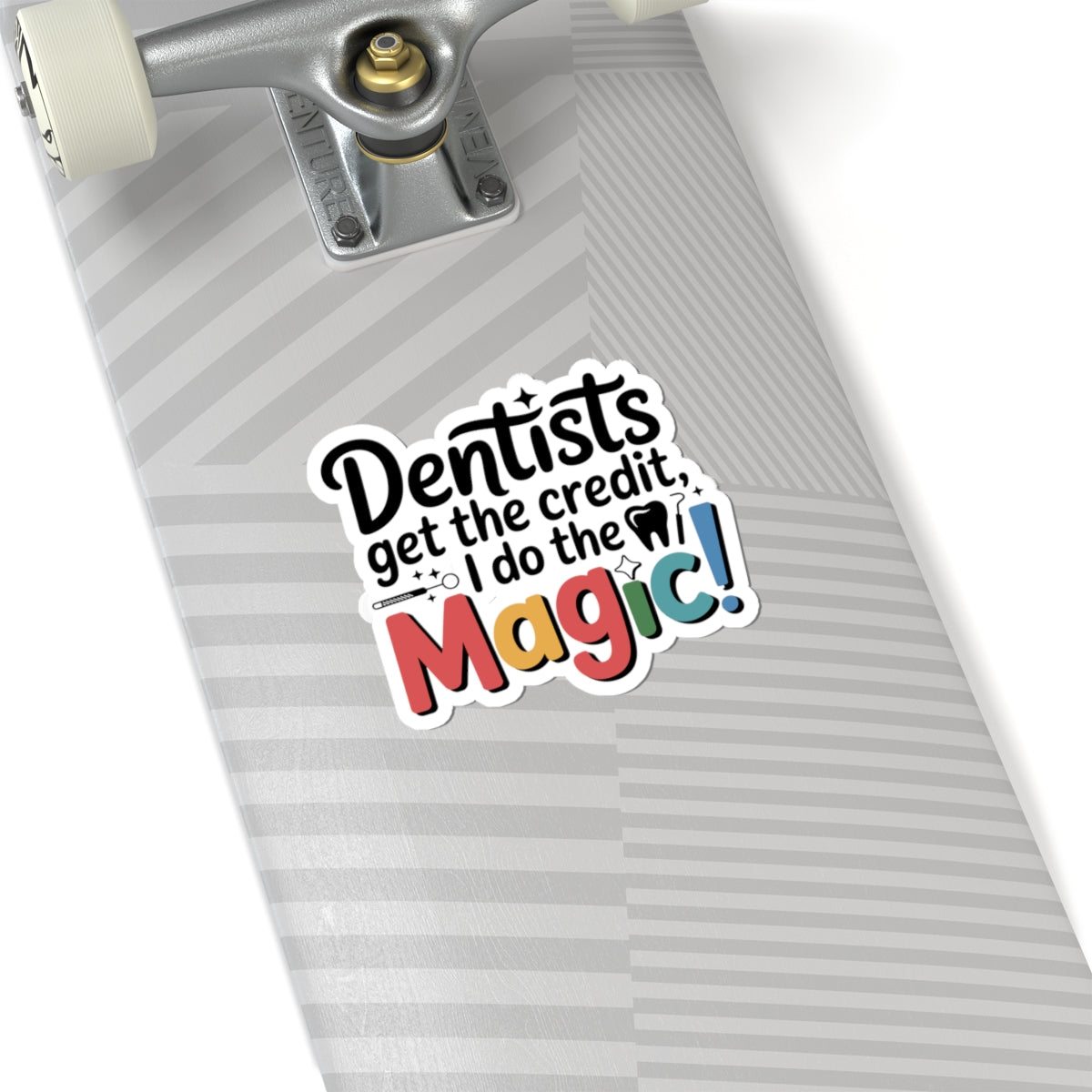 Celebrate the artistry behind every perfect smile with this "Dentists Get the Credit, I Do the Magic!" lab sticker. Designed for dental ceramists, crown technicians, and prosthodontic specialists, this decal honors the skilled hands that transform raw materials into lifelike restorations. Product features - Glossy paper finish for a scratch-resistant surface. - Long-lasting vinyl with a strong adhesive suitable for smooth flat surfaces. - Vibrant colors printed with eco-friendly inks for extraordinary brightness. - Available in white and transparent options, choose the perfect style. - Quick, smooth, and bubble-free application for easy decorating. Care instructions - Use a soft, clean and dry cloth to gently brush any dust or dirt off from the center of the sticker outwards.