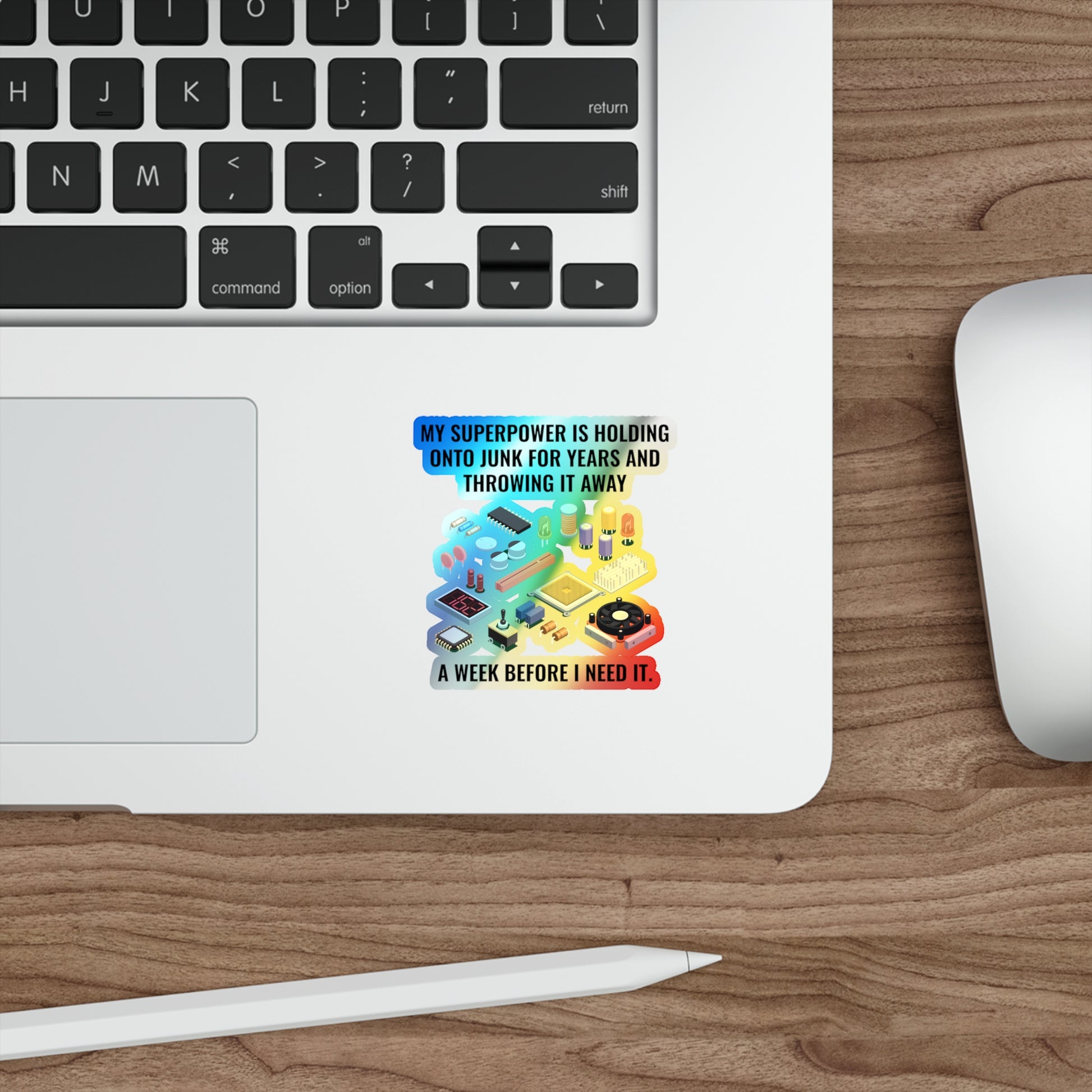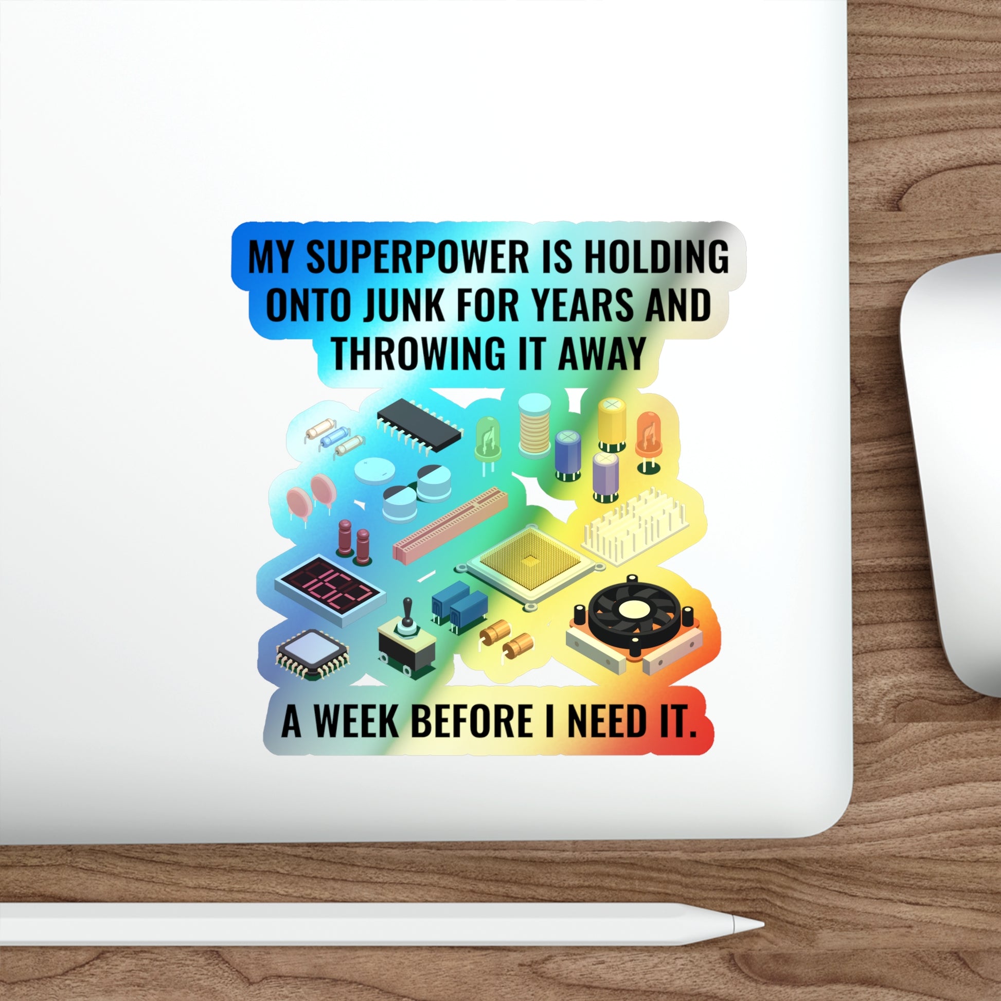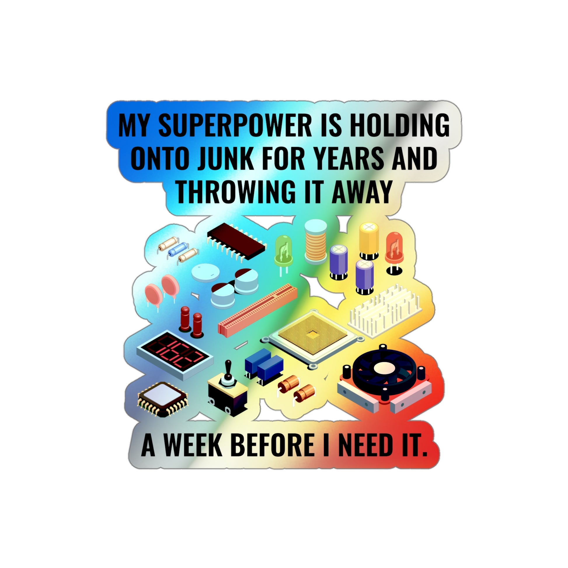 Laugh at your shack organization struggles with this relatable holographic decal! Perfect for parts collectors, tinkerers, and radio enthusiasts who know the pain of throwing away that "one part" too soon. This humorous sticker is ideal for your workshop, toolbox, or shack to show your fellow hams you understand their pain.