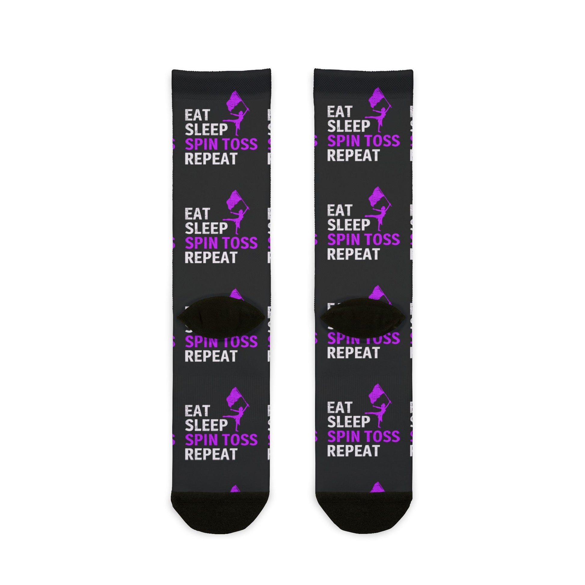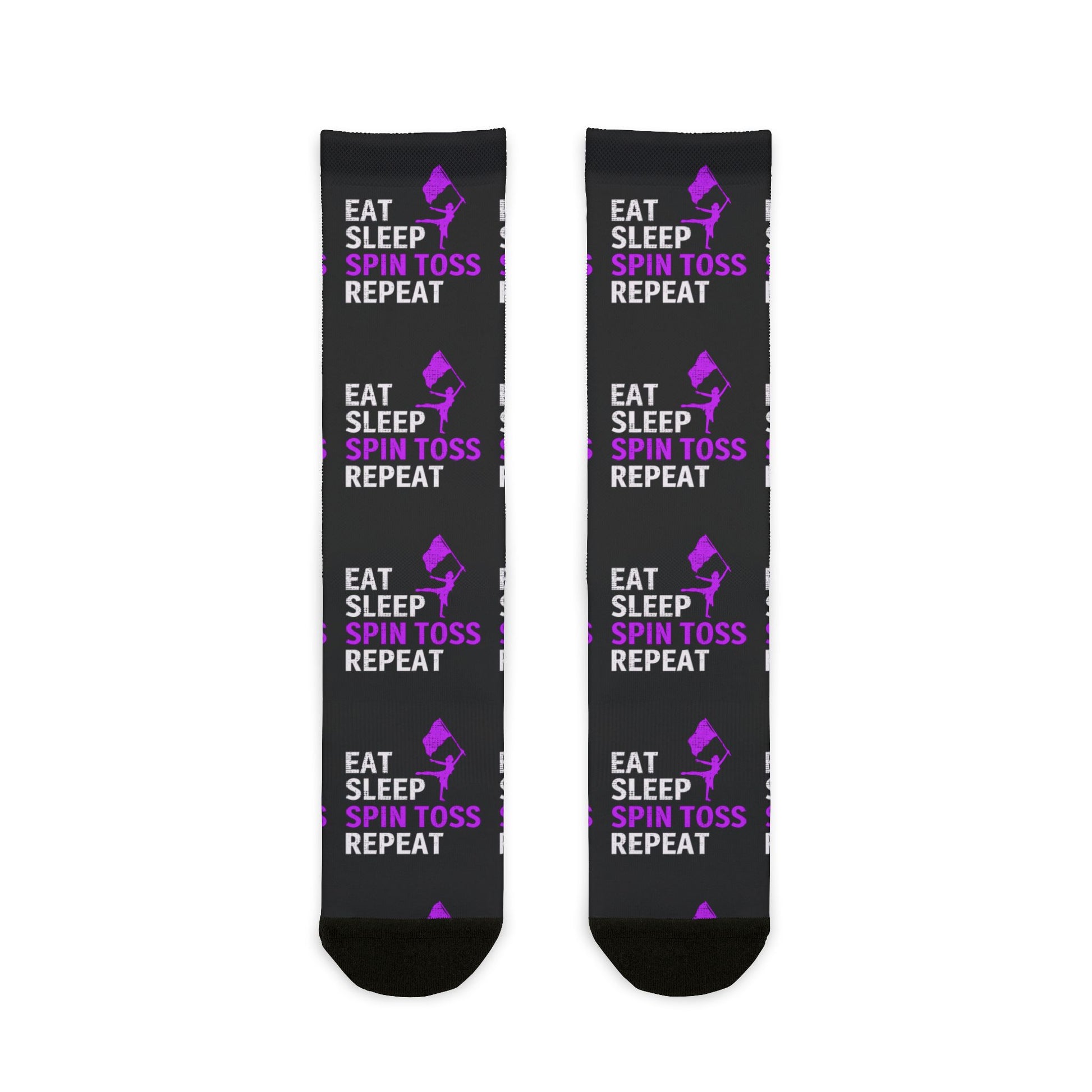 Color Guard socks that showcase your passion for the sport. These fun and stylish socks feature a design inspired by the popular saying "Eat Sleep Spin Toss Repeat." Perfect for dance team members, cheerleaders, and anyone who loves the energy and excitement of color guard.