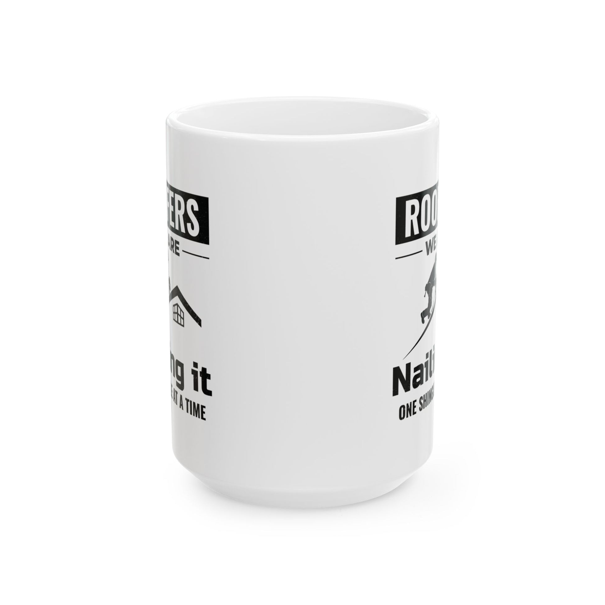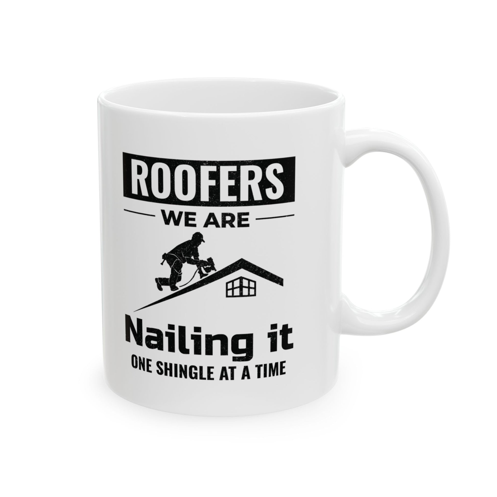 Start your day strong with this Roofer mug, designed for those who live and breathe roofing. Featuring a silhouette of a roofer nailing shingles and the phrase "Nailing It," this mug captures the spirit of the trade. Ideal for coffee, tea, or any beverage, it's the perfect companion on the job site or at home. Makes a thoughtful present for the roofer in your life. Warm-up with a nice cuppa out of this customized ceramic coffee mug. It’s BPA and Lead-free, microwave & dishwasher-safe, and made of white, durable ceramic in 11-ounce and 15-ounce sizes. Thanks to the advanced printing tech, your designs come to life with incredibly vivid colors – the perfect gift for coffee, tea, and chocolate lovers. .: These mugs are made with durable white ceramic so that your prints can stand out. .: Available in two sizes: 11oz (0.33 l) and 15oz (0.44 l) .: All mugs feature a comfortable C-handle and a shiny finish so that they're both easy to use and great to look at. .: Drink confidently on a daily basis as all mugs are lead and BPA-free.