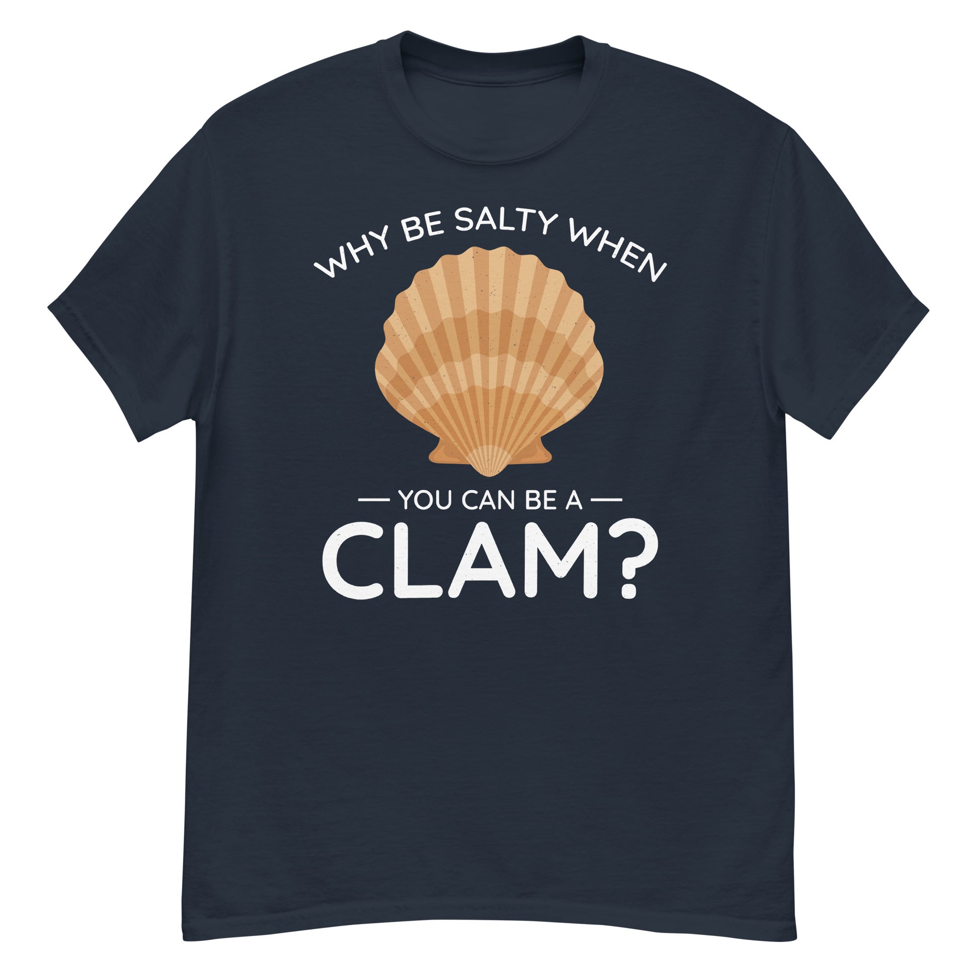 Show off your relaxed attitude with this Clam Shell T-Shirt featuring the witty phrase, "Why Be Salty When You Can Be a Clam?" Perfect for beach lovers and those who embrace a laid-back lifestyle.