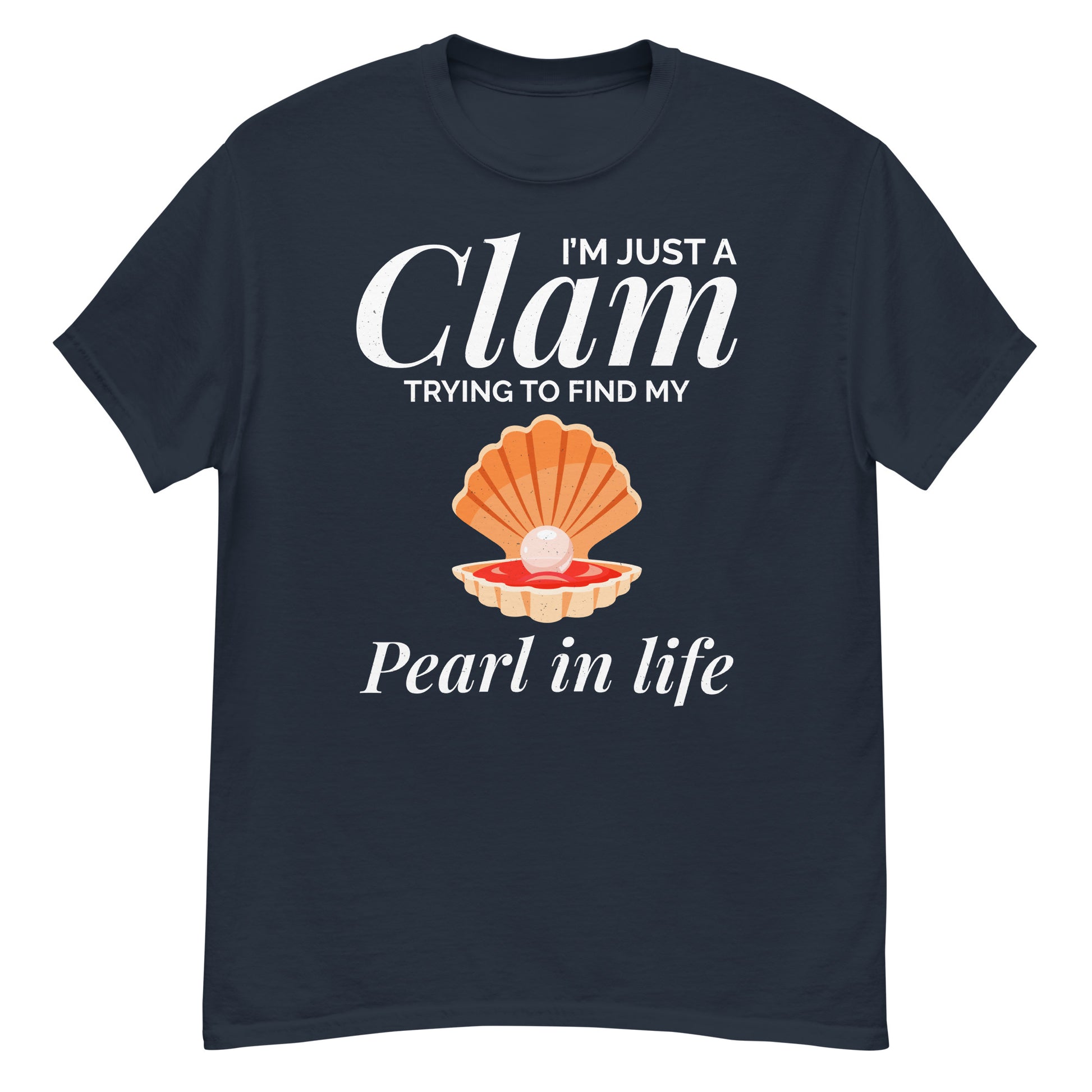 Embrace your journey with this Clam Shell T-Shirt featuring the inspiring phrase, "I’m Just a Clam Trying to Find My Pearl in Life." Ideal for those who appreciate a touch of wisdom and a love for the ocean.