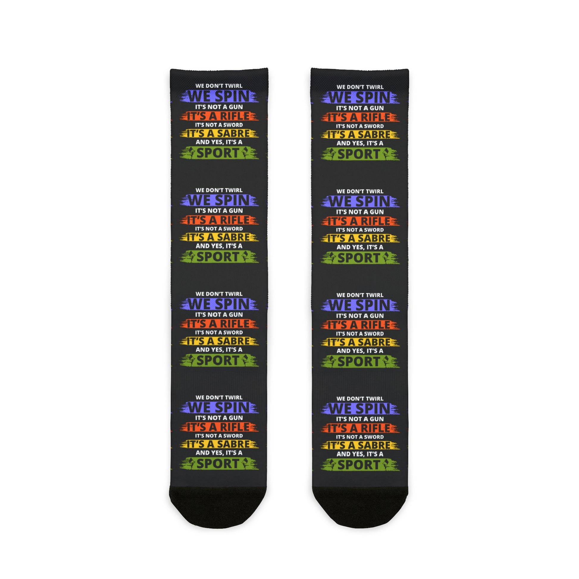 Show your love for Color Guard with these statement-making socks. Featuring the empowering phrase "We Don’t Twirl, We Spin," these socks are perfect for performers who take pride in their craft. Designed to inspire and motivate, they’re a must-have for Color Guard athletes and marching team members.