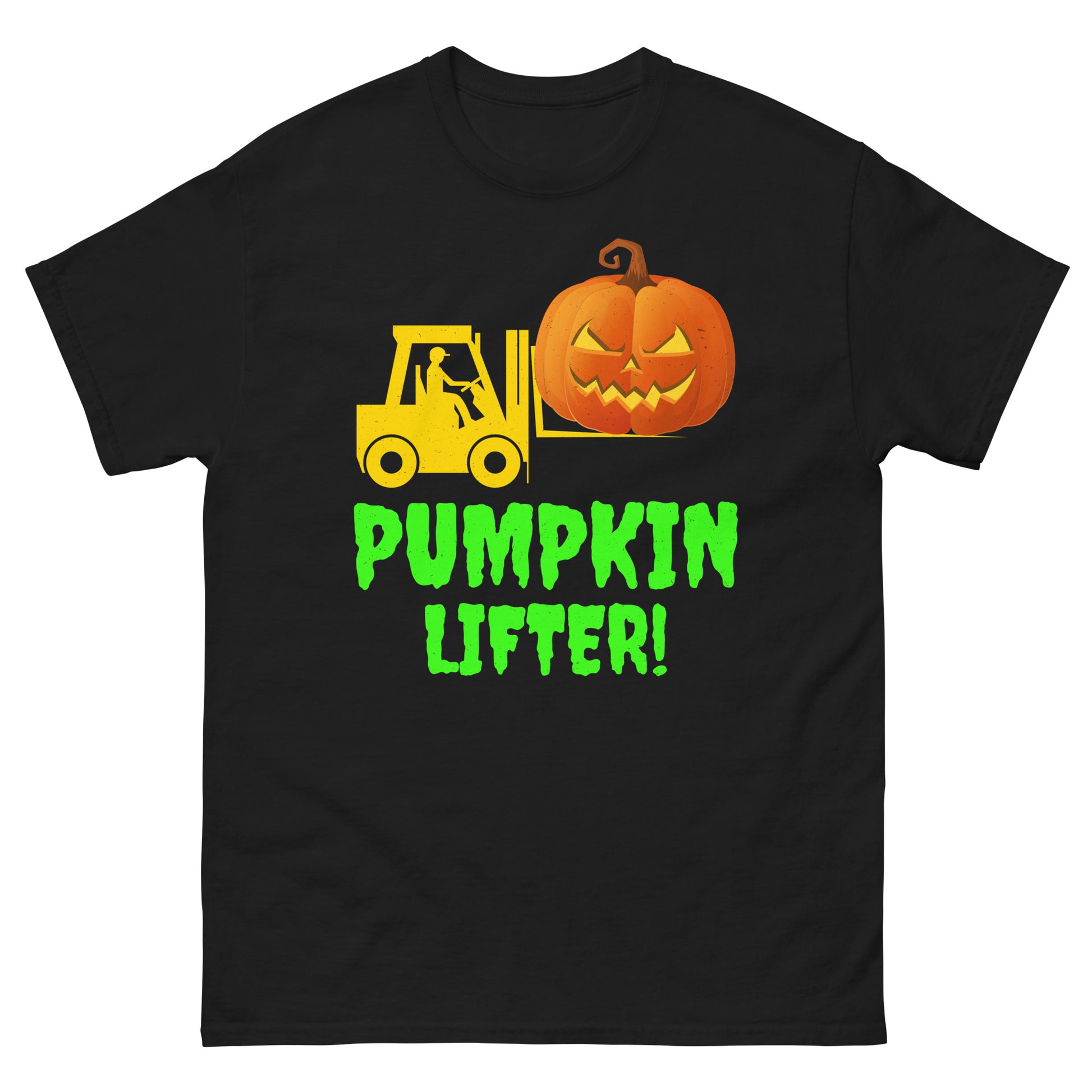 Celebrate Halloween with the "Forklift Operator: The Pumpkin Lifter!" T-Shirt, perfect for operators lifting both pallets and pumpkins this spooky season.