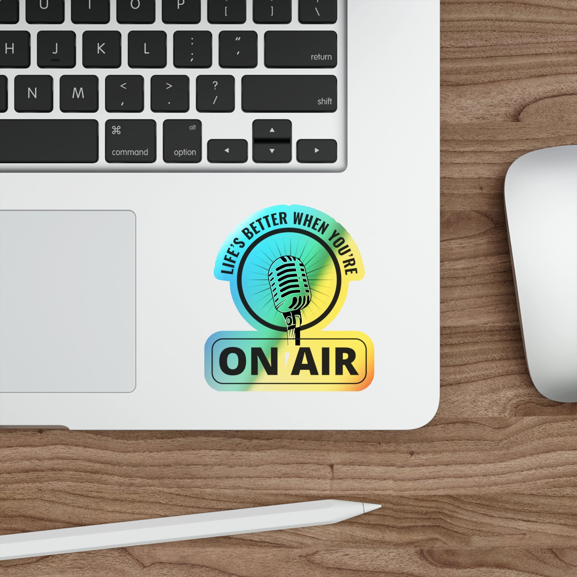 Celebrate the joy of being on the air with this vibrant holographic decal! Perfect for active operators, radio enthusiasts, and hams who find their happiest moments during transmissions. This sticker captures the essence of ham radio living, ideal for your shack, gear, or vehicle. Product features - Interior & short-term exterior applications - 99% opaque holographic finish - Long-lasting premium vinyl (up to 5 years) - Easy peel backing for quick application - Printed with eco-friendly inks for vibrant colors Care instructions - Use a soft, clean and dry cloth to gently brush any dust or dirt off from the center of the sticker outwards.