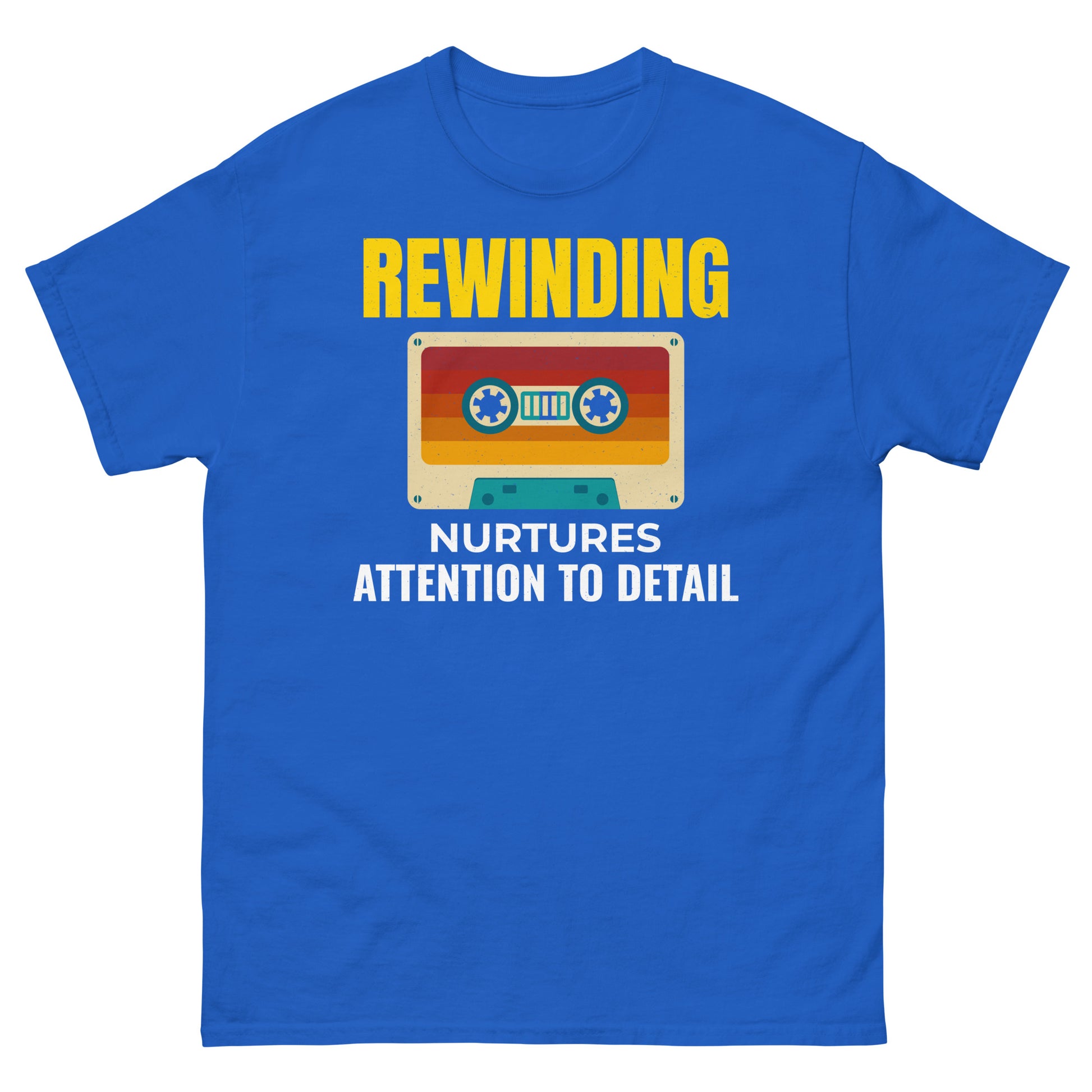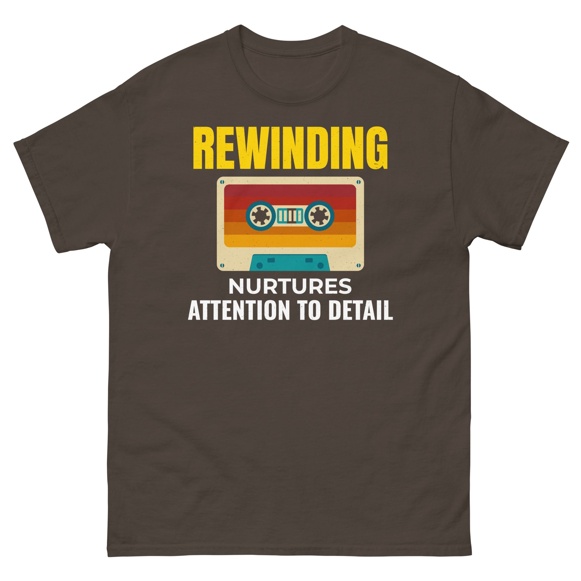 Cassette Tape Rewinding T-Shirt - "Rewinding: Nurtures Attention to Detail"