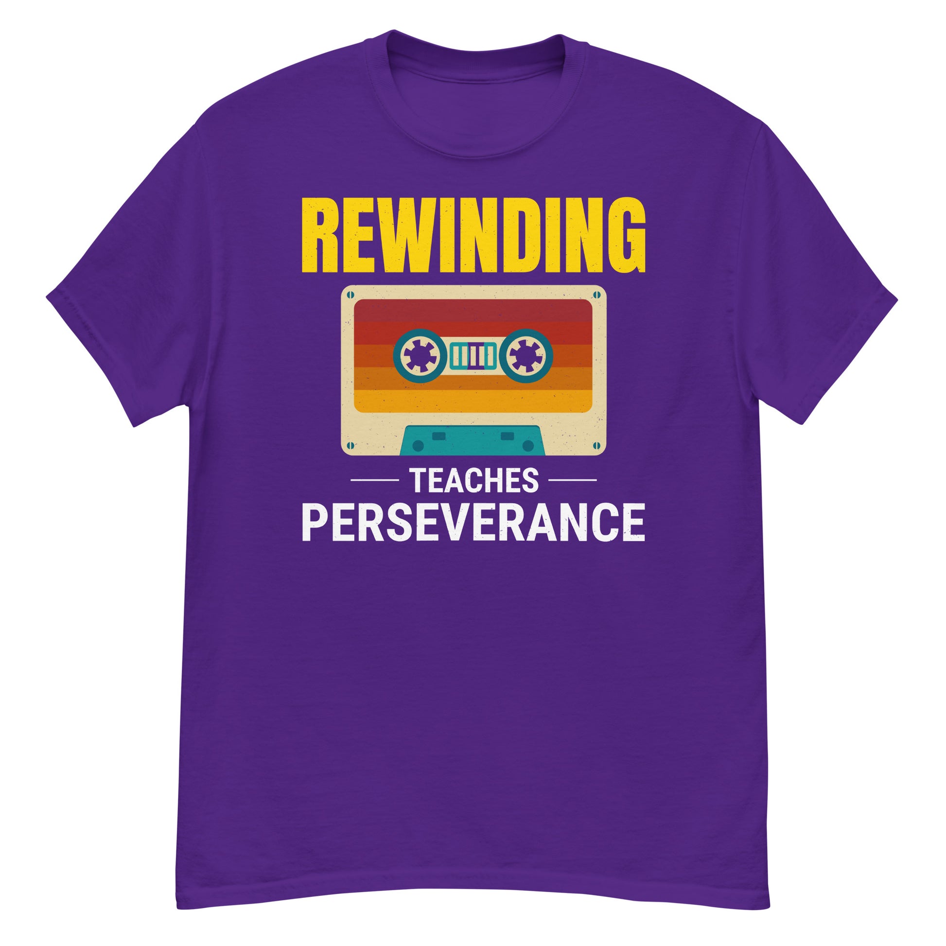 Celebrate the patience and charm of the cassette tape era with our "Rewinding: Teaches Perseverance" T-Shirt. Perfect for music lovers and retro enthusiasts, this t-shirt captures the essence of perseverance and nostalgia that comes with manually rewinding tapes.