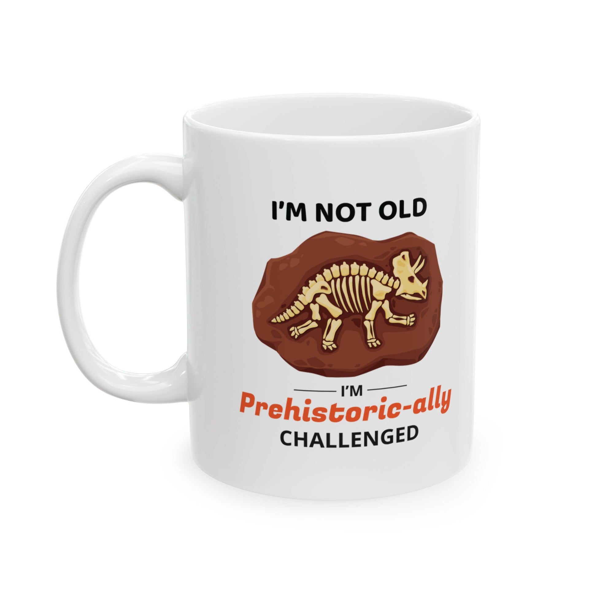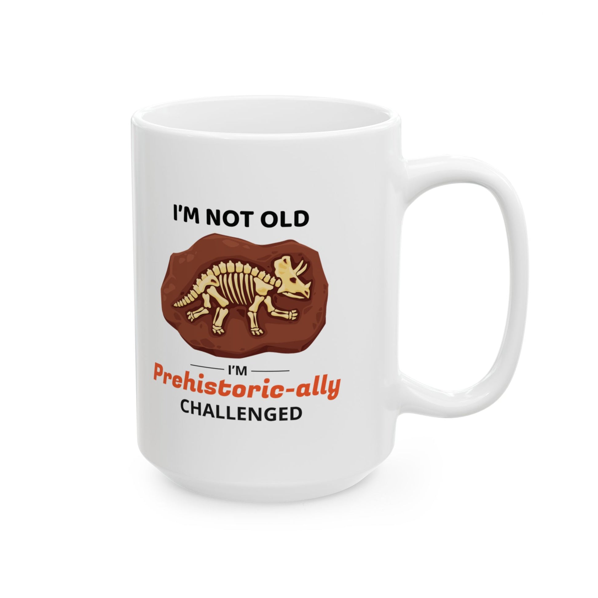 Embrace your inner dinosaur enthusiast with our Dinosaur Fossil Mug, featuring the playful "Prehistoric-ally Challenged" design. This mug is perfect for those who love dinosaurs and have a sense of humor about their prehistoric passion. Add a fun and unique touch to your daily coffee or tea routine with this charming mug. Warm-up with a nice cuppa out of this customized ceramic coffee mug. It’s BPA and Lead-free, microwave & dishwasher-safe, and made of white, durable ceramic in 11-ounce and 15-ounce sizes. Thanks to the advanced printing tech, your designs come to life with incredibly vivid colors – the perfect gift for coffee, tea, and chocolate lovers. .: These mugs are made with durable white ceramic so that your prints can stand out. .: Available in two sizes: 11oz (0.33 l) and 15oz (0.44 l) .: All mugs feature a comfortable C-handle and a shiny finish so that they're both easy to use and great to look at. .: Drink confidently on a daily basis as all mugs are lead and BPA-free.