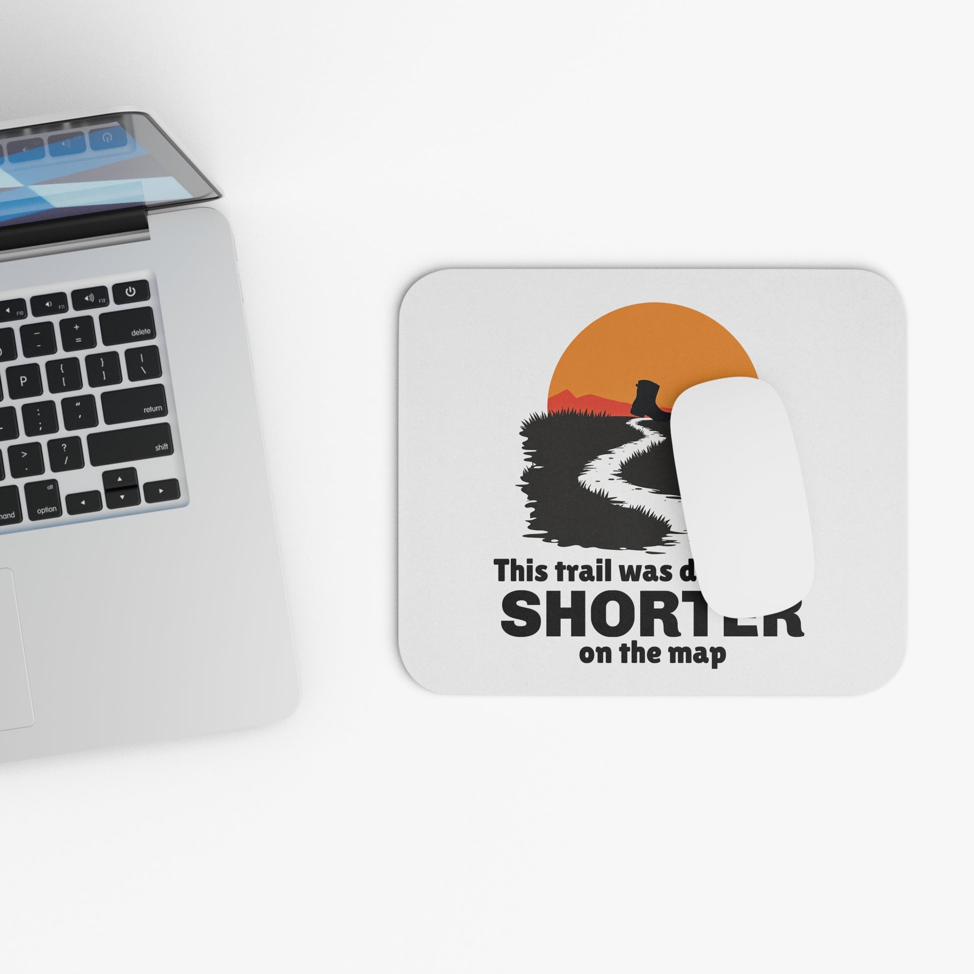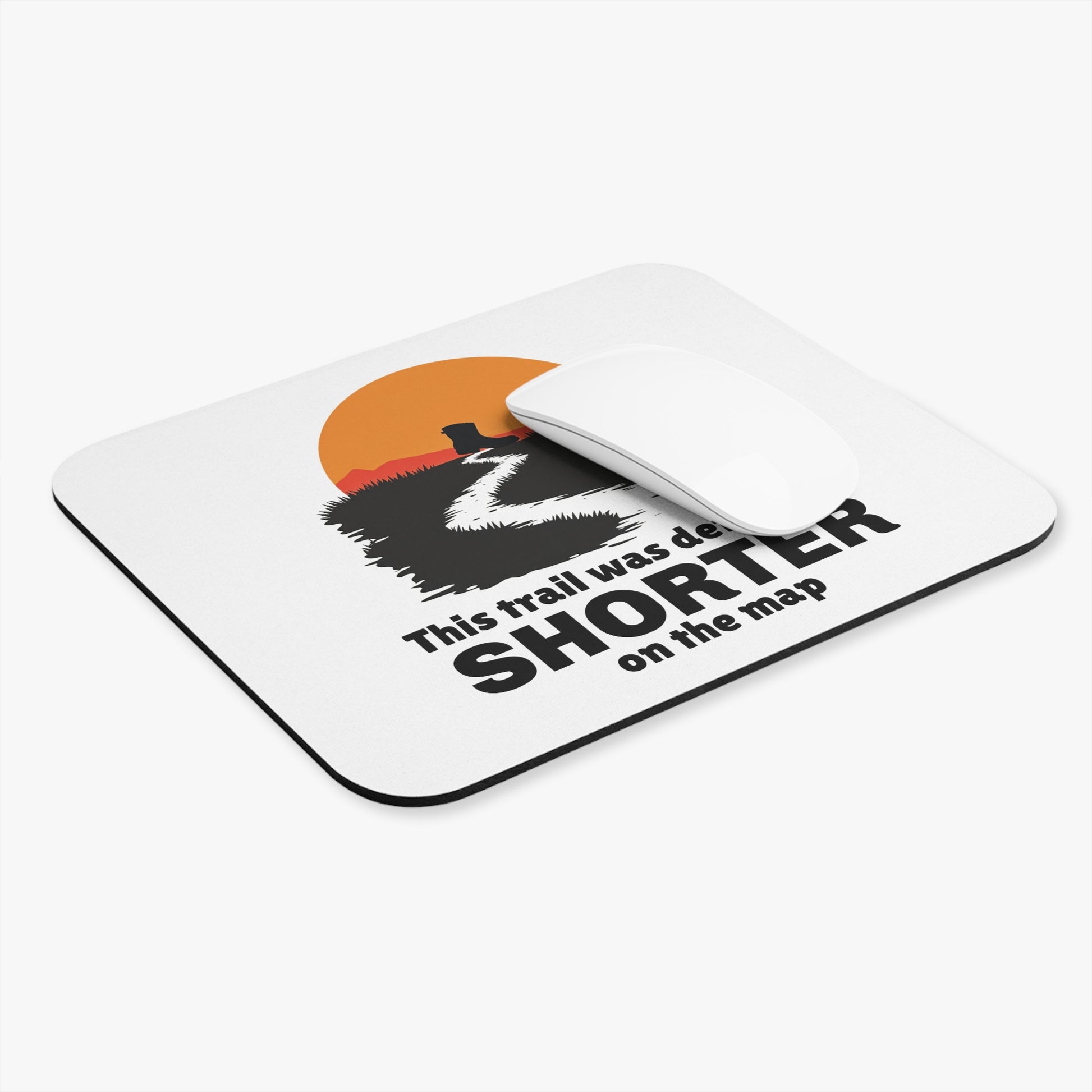 Add a touch of trail humor to your desk with this unique mouse pad, featuring the relatable phrase, "This trail was definitely SHORTER on the map." Perfect for hikers, trail runners, and outdoor enthusiasts, this pad captures the playful reality of map reading and adventure. The non-slip rubber base provides stability, making it an ideal companion for planning routes, recounting trail stories, or just adding a smile to your workspace. Designed for backpackers, campers, and anyone who loves exploring, this mouse pad celebrates the joys and challenges of outdoor navigation.
