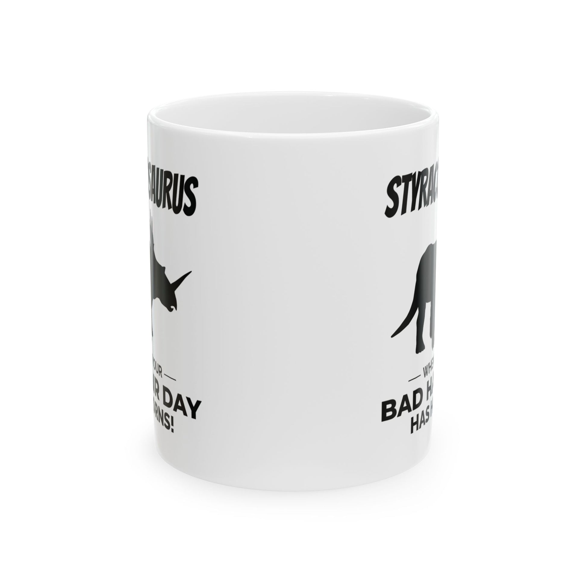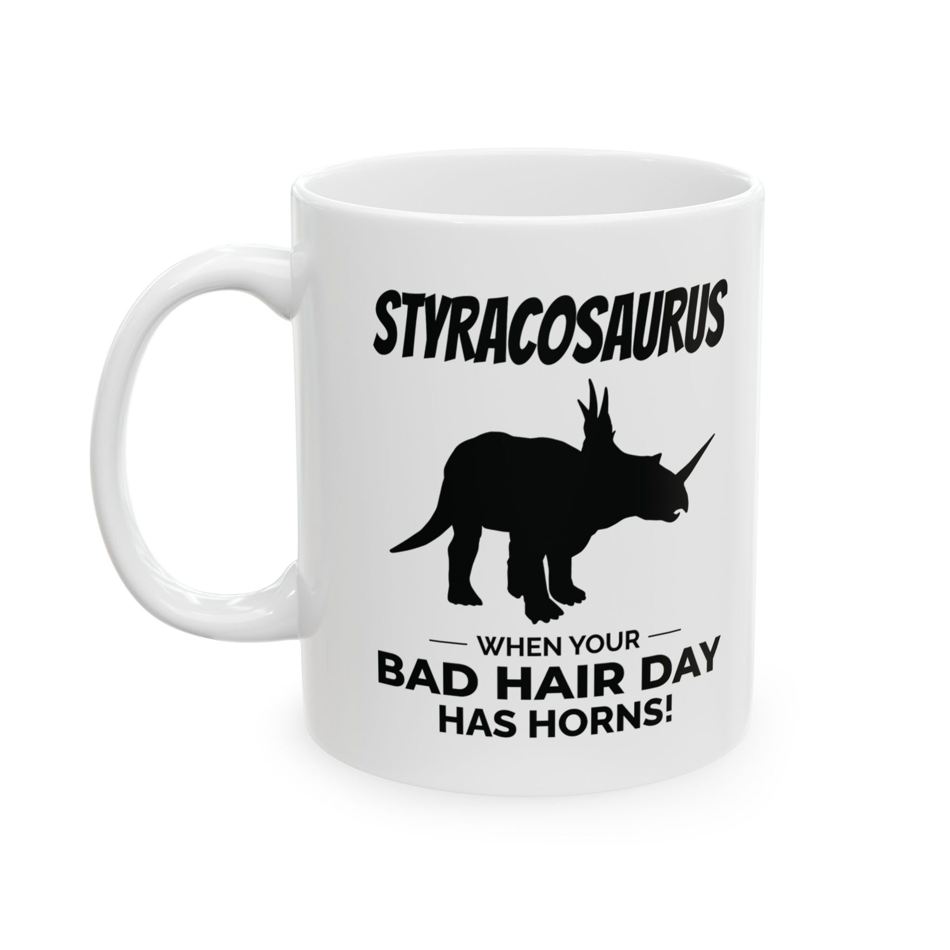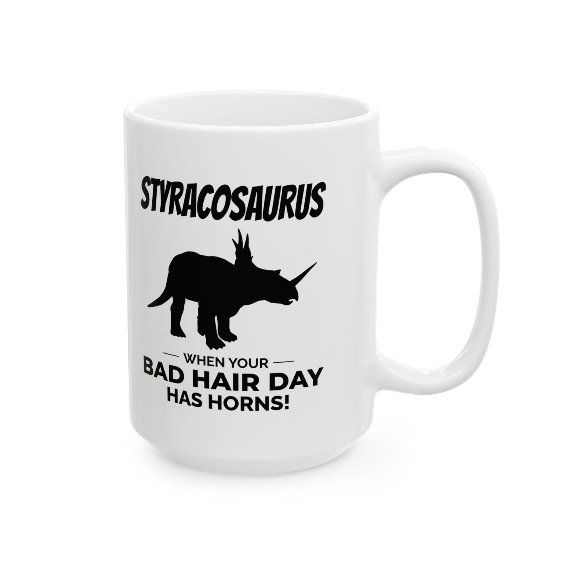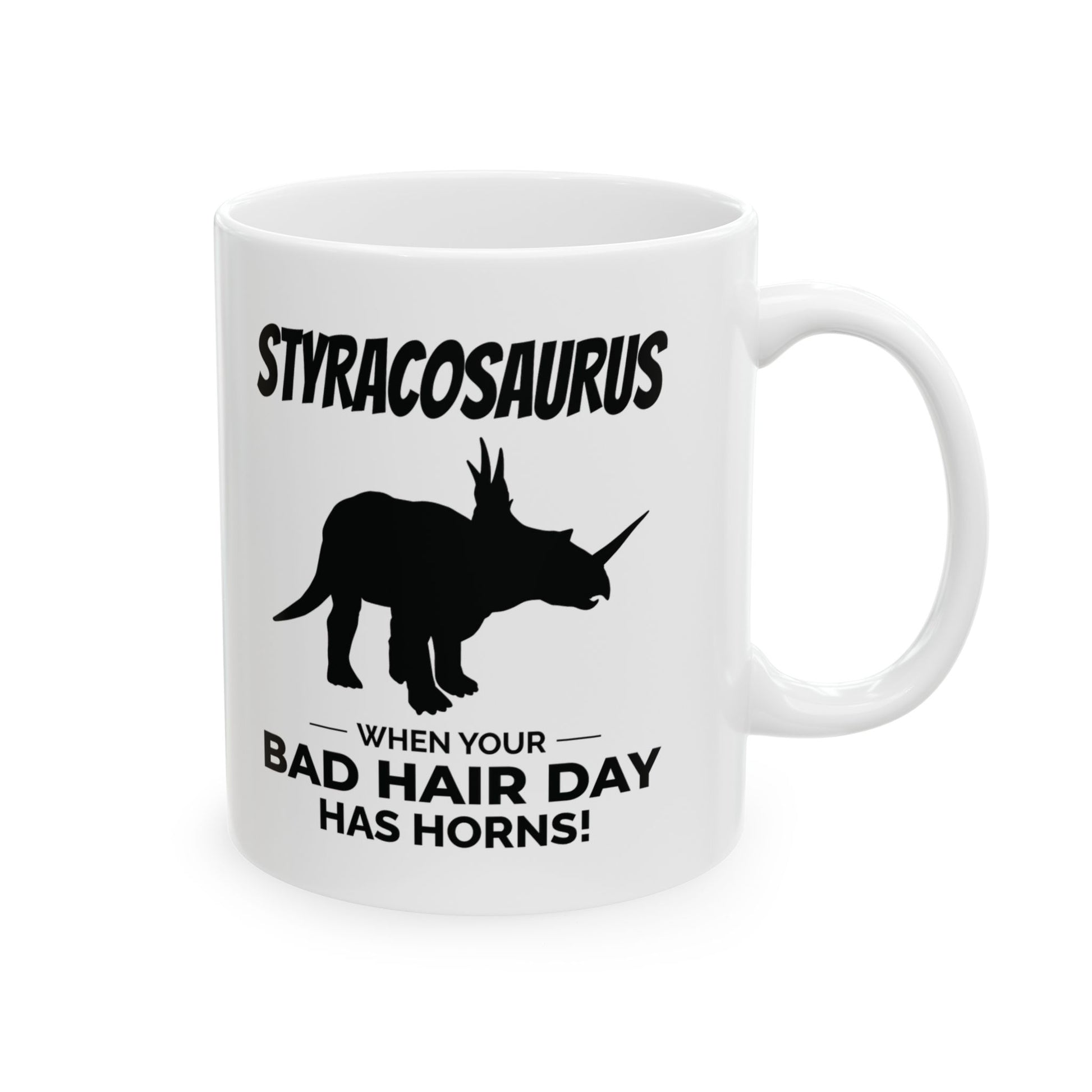 "¡Cuando tu mal día de pelo tiene cuernos!" Disfruta del humor prehistórico con esta taza con fósil de dinosaurio Styracosaurus. Con la audaz silueta del Styracosaurus, conocido por su impresionante volante y cuernos, esta taza le da un toque de humor y humor a tu día. Su cita humorística la convierte en el regalo perfecto para cualquier entusiasta de los dinosaurios con pasión por los diseños originales. ¡Disfruta de tu bebida favorita con un toque de humor antiguo y un encanto cornudo! Entra en calor con una buena taza de café en esta taza de cerámica personalizada. Es libre de BPA y plomo, apta para microondas y lavavajillas, y está hecha de cerámica blanca resistente en tamaños de 325 y 440 ml. Gracias a la avanzada tecnología de impresión, tus diseños cobran vida con colores increíblemente vivos: el regalo perfecto para los amantes del café, el té y el chocolate. Estas tazas están hechas de cerámica blanca resistente para que tus impresiones destaquen. .: Disponible en dos tamaños: 11 oz (0,33 l) y 15 oz (0,44 l) .: Todas las tazas cuentan con un cómodo asa en forma de C y un acabado brillante para que sean fáciles de usar y agradables a la vista. .: Beba con confianza todos los días ya que todas las tazas están libres de plomo y BPA.