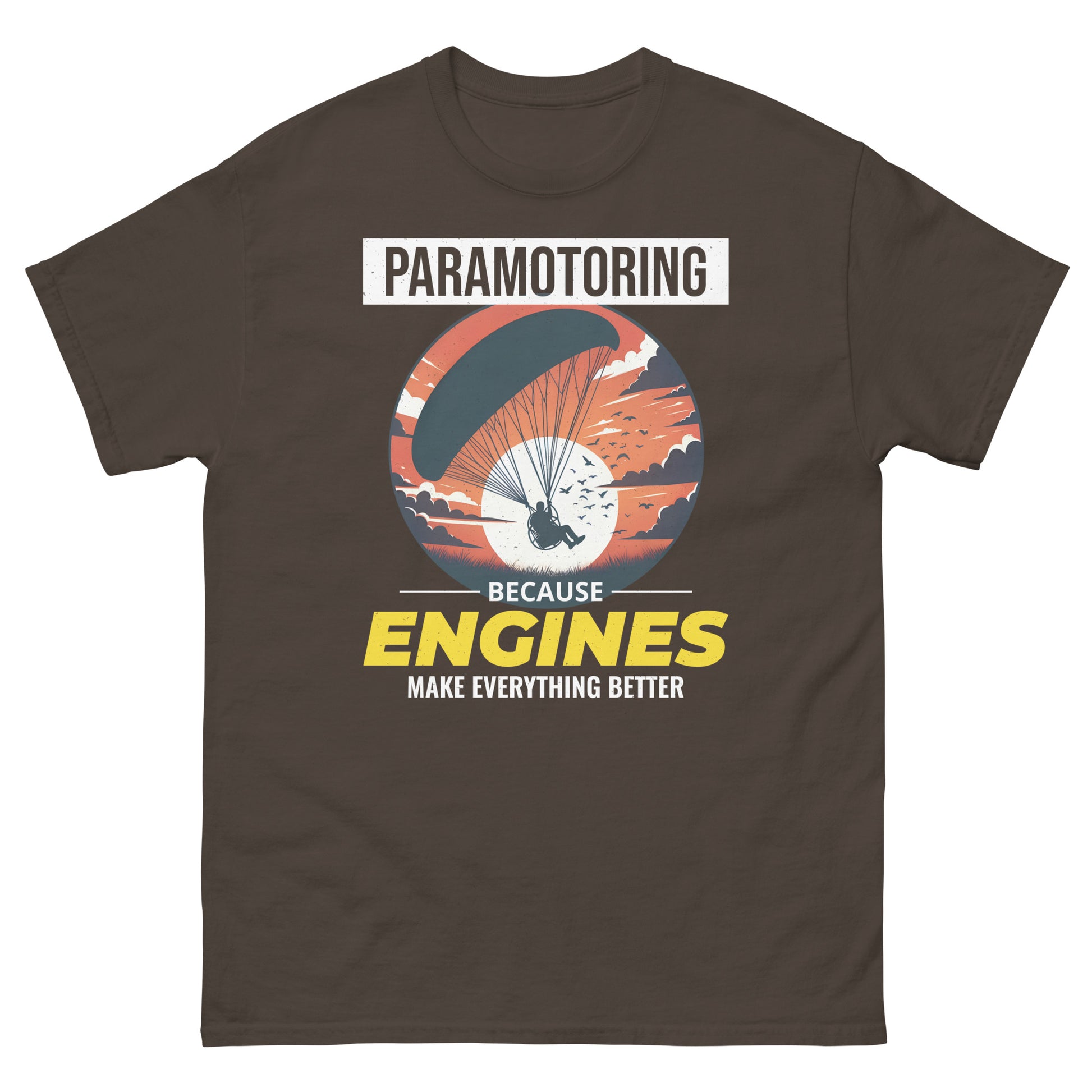 Abrace la mejora del paramotor con esta camiseta que dice: "Paramotor: porque los motores hacen que todo sea mejor". Perfecto para los entusiastas del parapente motorizado que aprecian la potencia y la emoción de volar con un motor.
