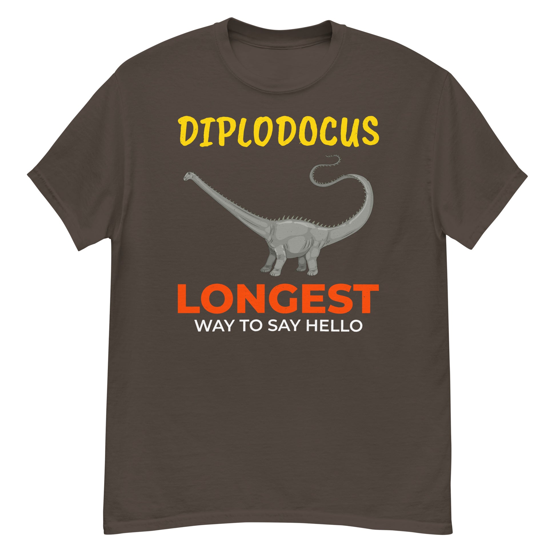 Celebrate the gentle giant Diplodocus with this humorous Paleontologist T-Shirt. Featuring the phrase "Diplodocus: The Longest Way to Say ‘Hello’," this shirt is perfect for fans of long-necked dinosaurs and prehistoric charm.