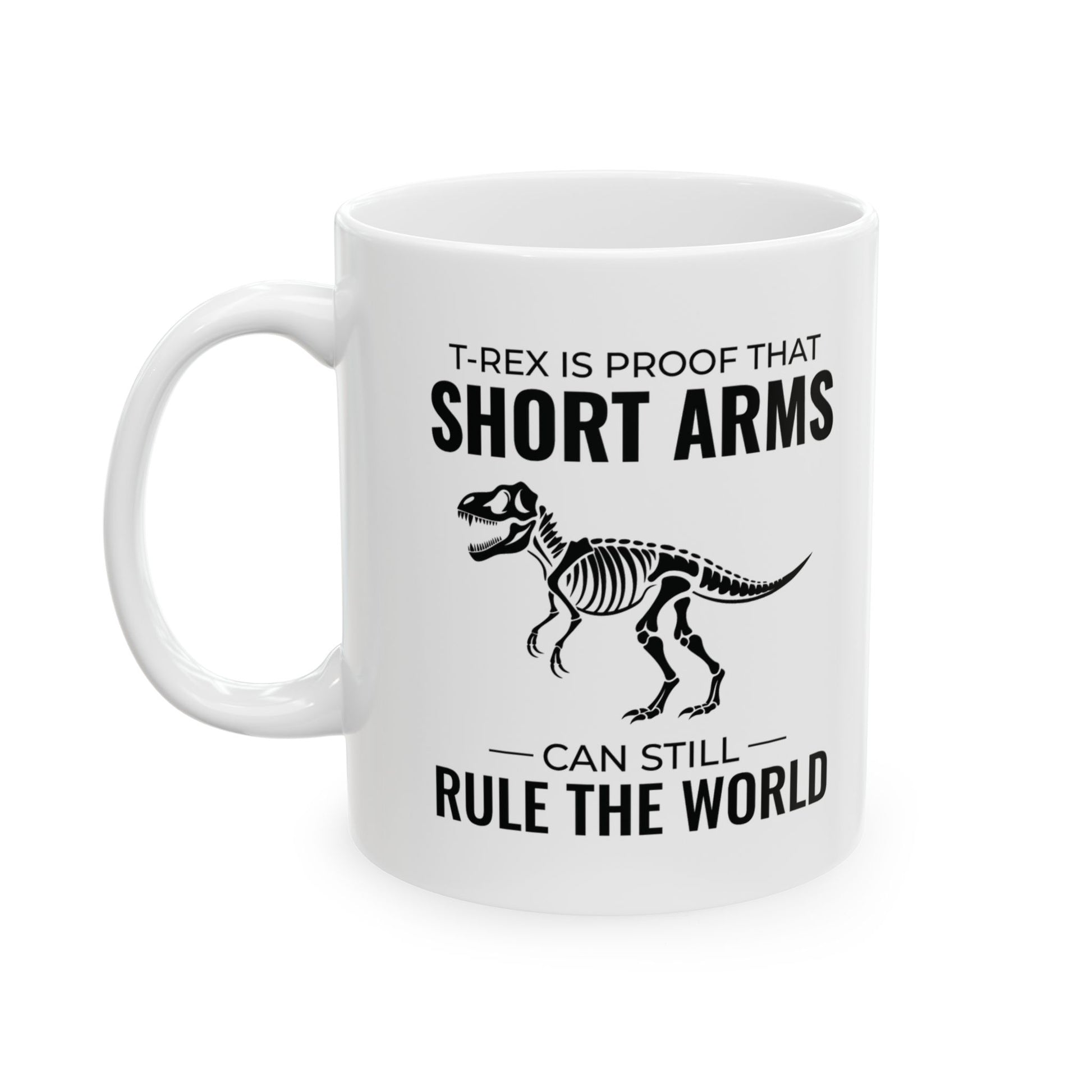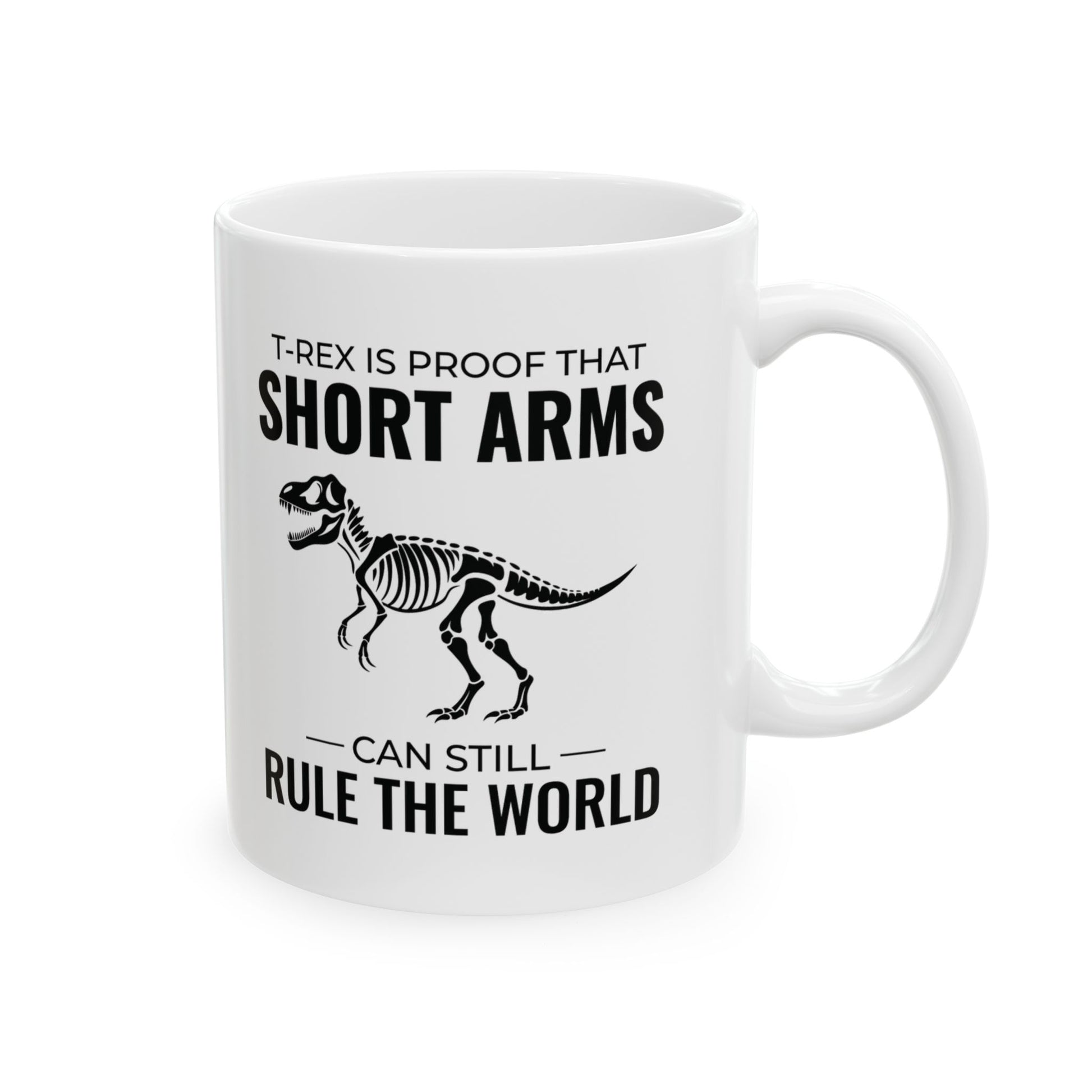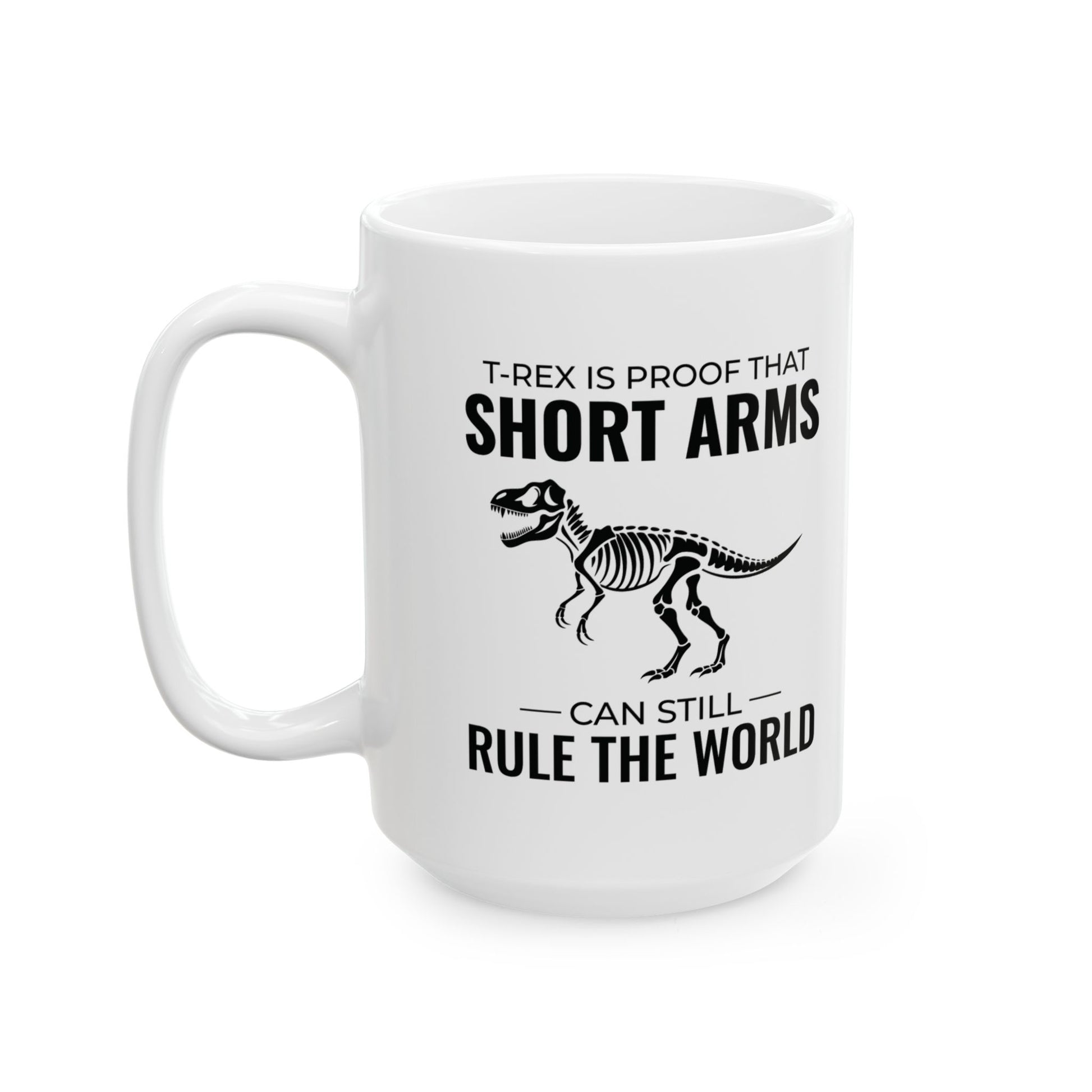 This striking T-Rex skeleton mug features a humorous take on evolutionary adaptation with its bold "T-REX IS PROOF THAT SHORT ARMS CAN STILL RULE THE WORLD" design. The dramatic black and white illustration showcases a detailed Tyrannosaurus Rex skeleton in profile, emphasizing its iconic silhouette and notorious tiny forelimbs. Perfect for paleontology lovers, fossil hunters, and anyone with a sense of humor about life's limitations. Warm-up with a nice cuppa out of this customized ceramic coffee mug. It’s BPA and Lead-free, microwave & dishwasher-safe, and made of white, durable ceramic in 11-ounce and 15-ounce sizes. Thanks to the advanced printing tech, your designs come to life with incredibly vivid colors – the perfect gift for coffee, tea, and chocolate lovers. .: These mugs are made with durable white ceramic so that your prints can stand out. .: Available in two sizes: 11oz (0.33 l) and 15oz (0.44 l) .: All mugs feature a comfortable C-handle and a shiny finish so that they're both easy to use and great to look at. .: Drink confidently on a daily basis as all mugs are lead and BPA-free.
