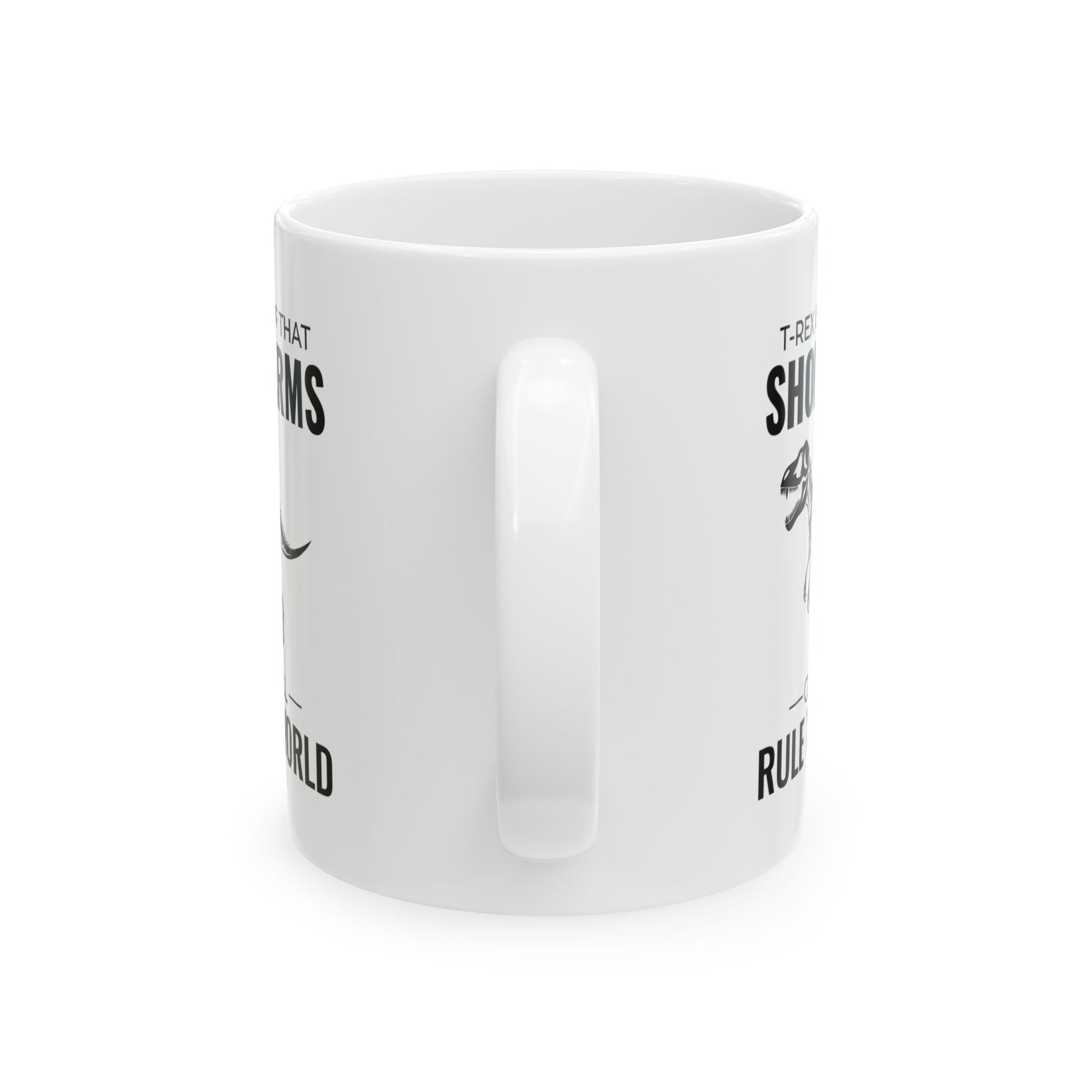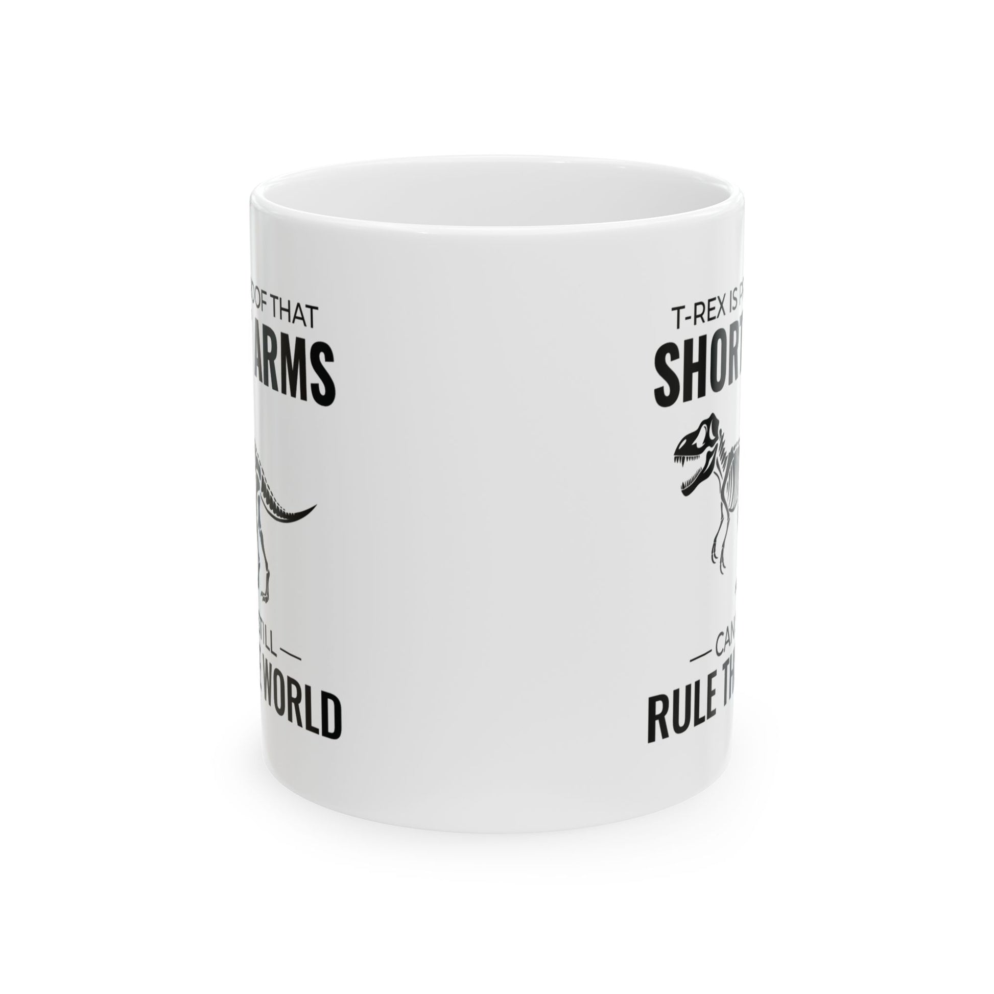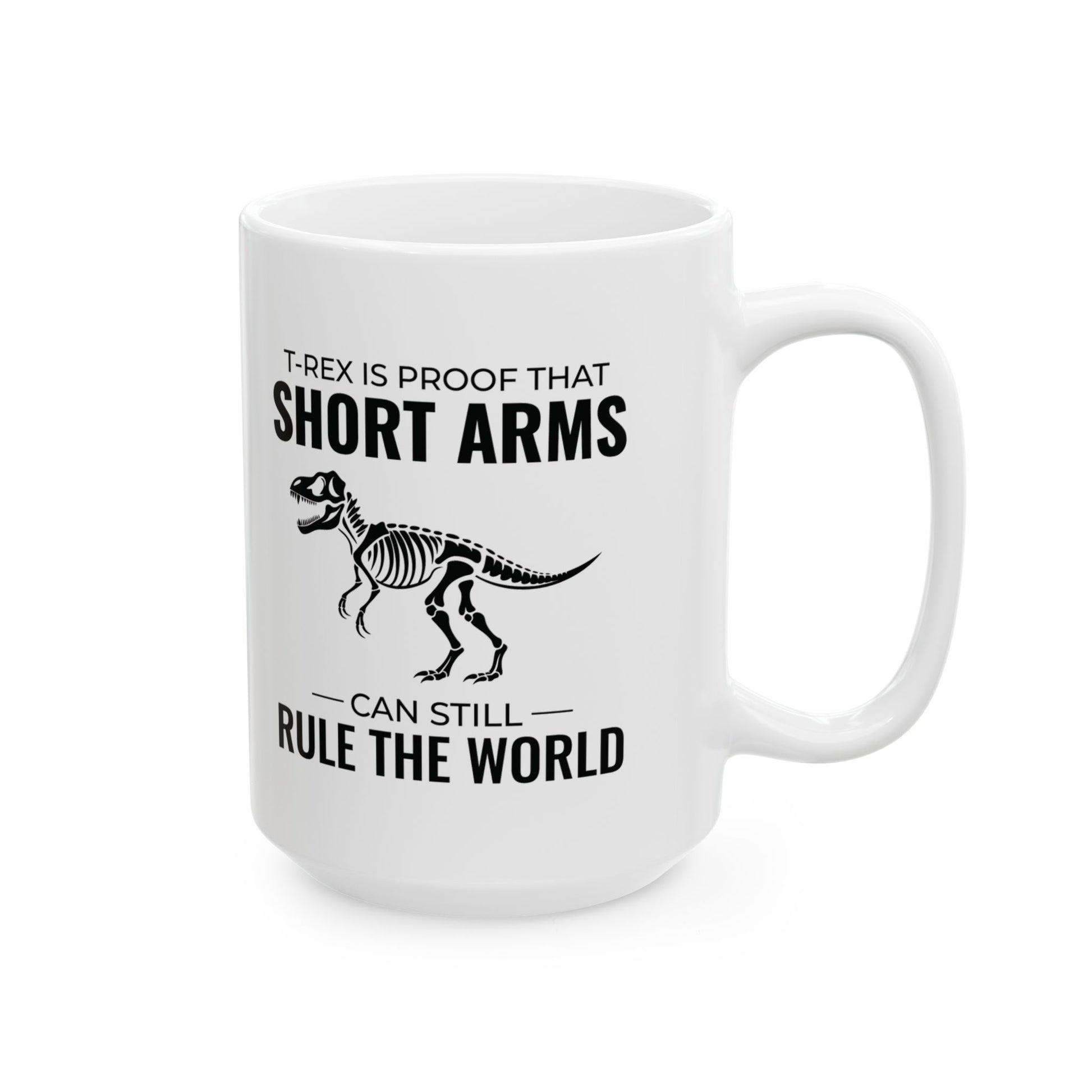 This striking T-Rex skeleton mug features a humorous take on evolutionary adaptation with its bold "T-REX IS PROOF THAT SHORT ARMS CAN STILL RULE THE WORLD" design. The dramatic black and white illustration showcases a detailed Tyrannosaurus Rex skeleton in profile, emphasizing its iconic silhouette and notorious tiny forelimbs. Perfect for paleontology lovers, fossil hunters, and anyone with a sense of humor about life's limitations. Warm-up with a nice cuppa out of this customized ceramic coffee mug. It’s BPA and Lead-free, microwave & dishwasher-safe, and made of white, durable ceramic in 11-ounce and 15-ounce sizes. Thanks to the advanced printing tech, your designs come to life with incredibly vivid colors – the perfect gift for coffee, tea, and chocolate lovers. .: These mugs are made with durable white ceramic so that your prints can stand out. .: Available in two sizes: 11oz (0.33 l) and 15oz (0.44 l) .: All mugs feature a comfortable C-handle and a shiny finish so that they're both easy to use and great to look at. .: Drink confidently on a daily basis as all mugs are lead and BPA-free.