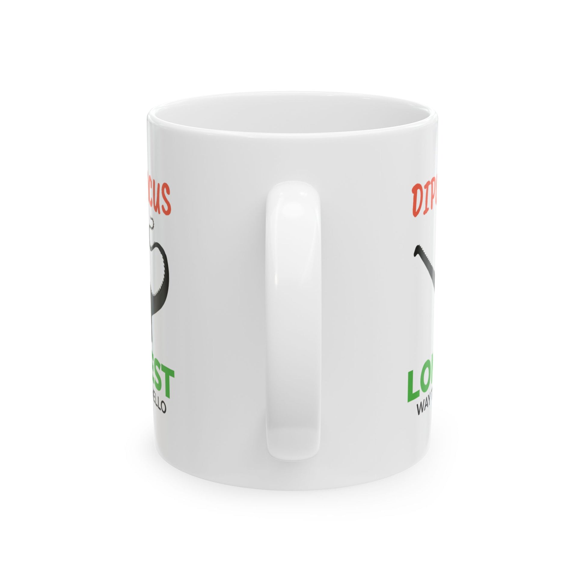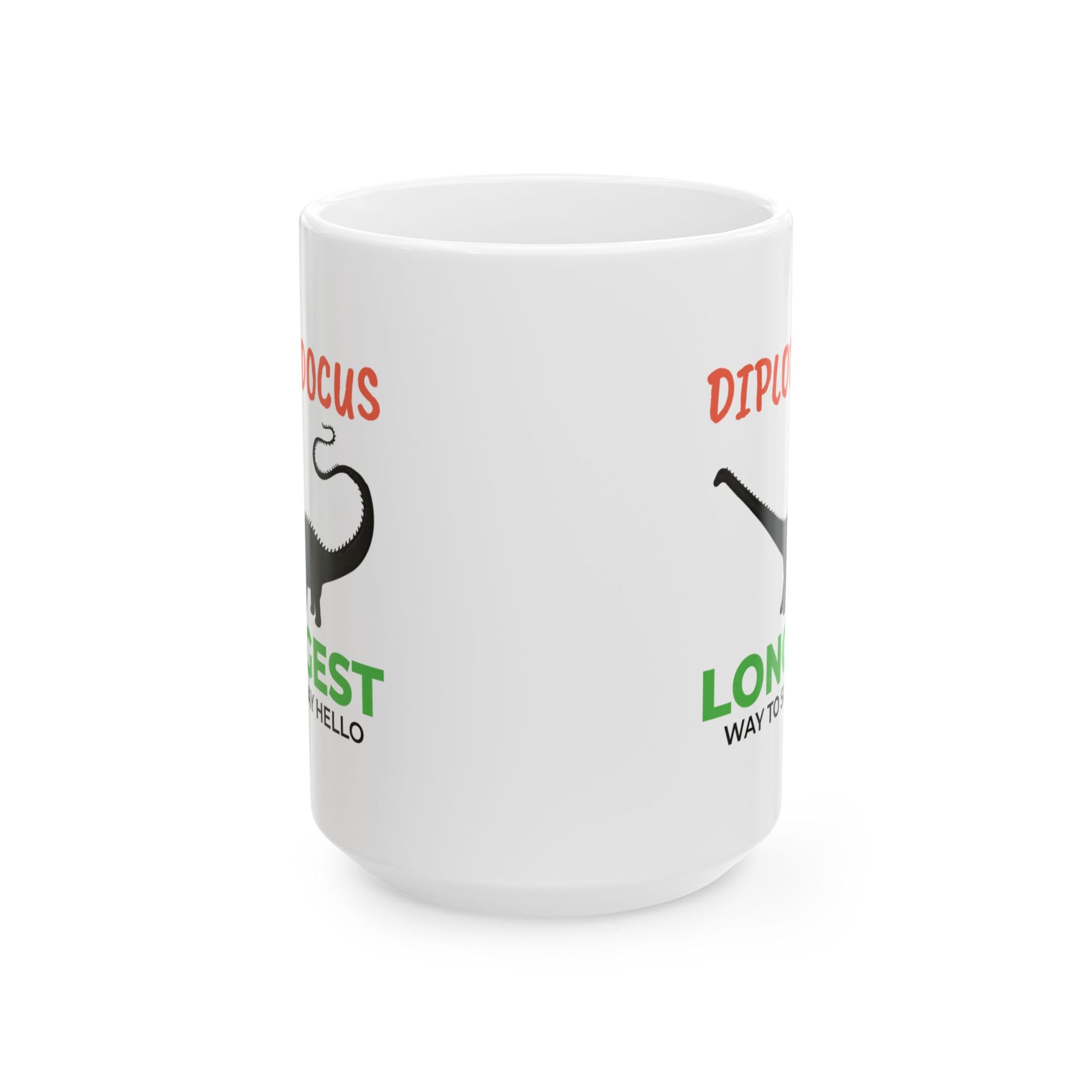This playful mug features a striking black Diplodocus silhouette with its remarkably long neck and tail gracefully curved, accompanied by the humorous phrase "DIPLODOCUS: LONGEST WAY TO SAY HELLO" in vibrant coral, green, and black typography. The design cleverly highlights the extraordinary length of this Jurassic sauropod while adding a witty twist about its extended anatomy. Perfect for paleontologists, dinosaur collectors, and anyone who appreciates prehistoric humor with their morning coffee. Warm-up with a nice cuppa out of this customized ceramic coffee mug. It’s BPA and Lead-free, microwave & dishwasher-safe, and made of white, durable ceramic in 11-ounce and 15-ounce sizes. Thanks to the advanced printing tech, your designs come to life with incredibly vivid colors – the perfect gift for coffee, tea, and chocolate lovers. .: These mugs are made with durable white ceramic so that your prints can stand out. .: Available in two sizes: 11oz (0.33 l) and 15oz (0.44 l) .: All mugs feature a comfortable C-handle and a shiny finish so that they're both easy to use and great to look at. .: Drink confidently on a daily basis as all mugs are lead and BPA-free.