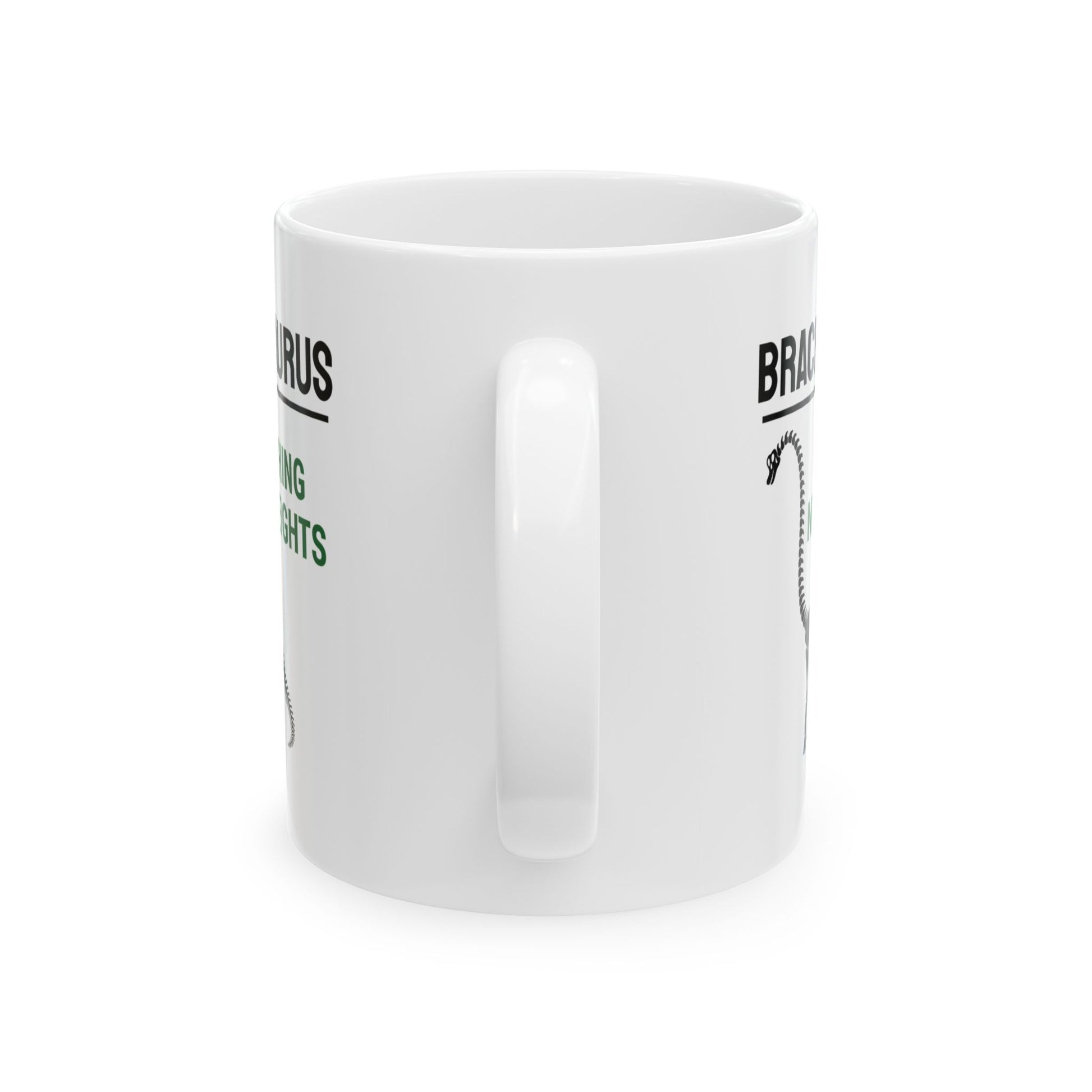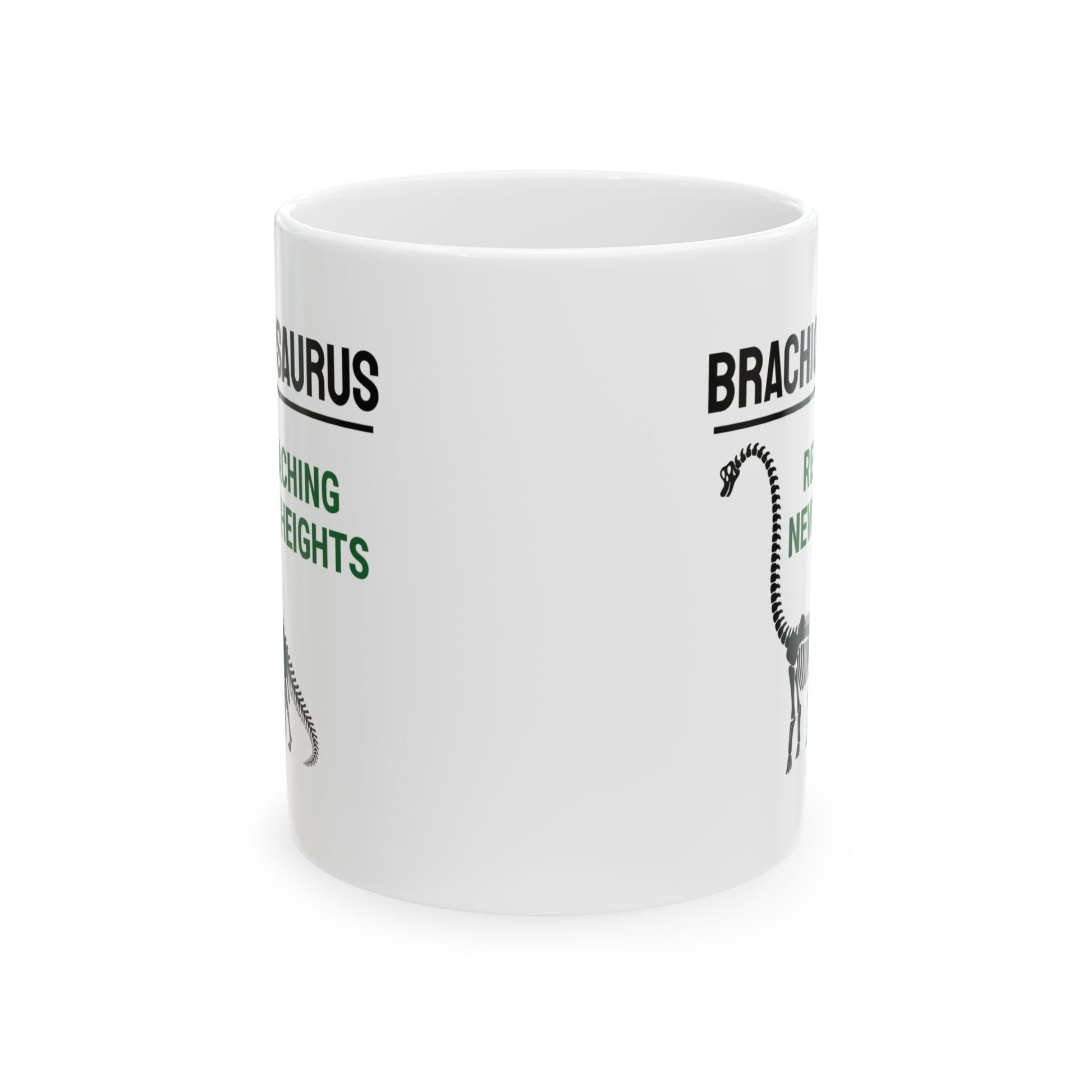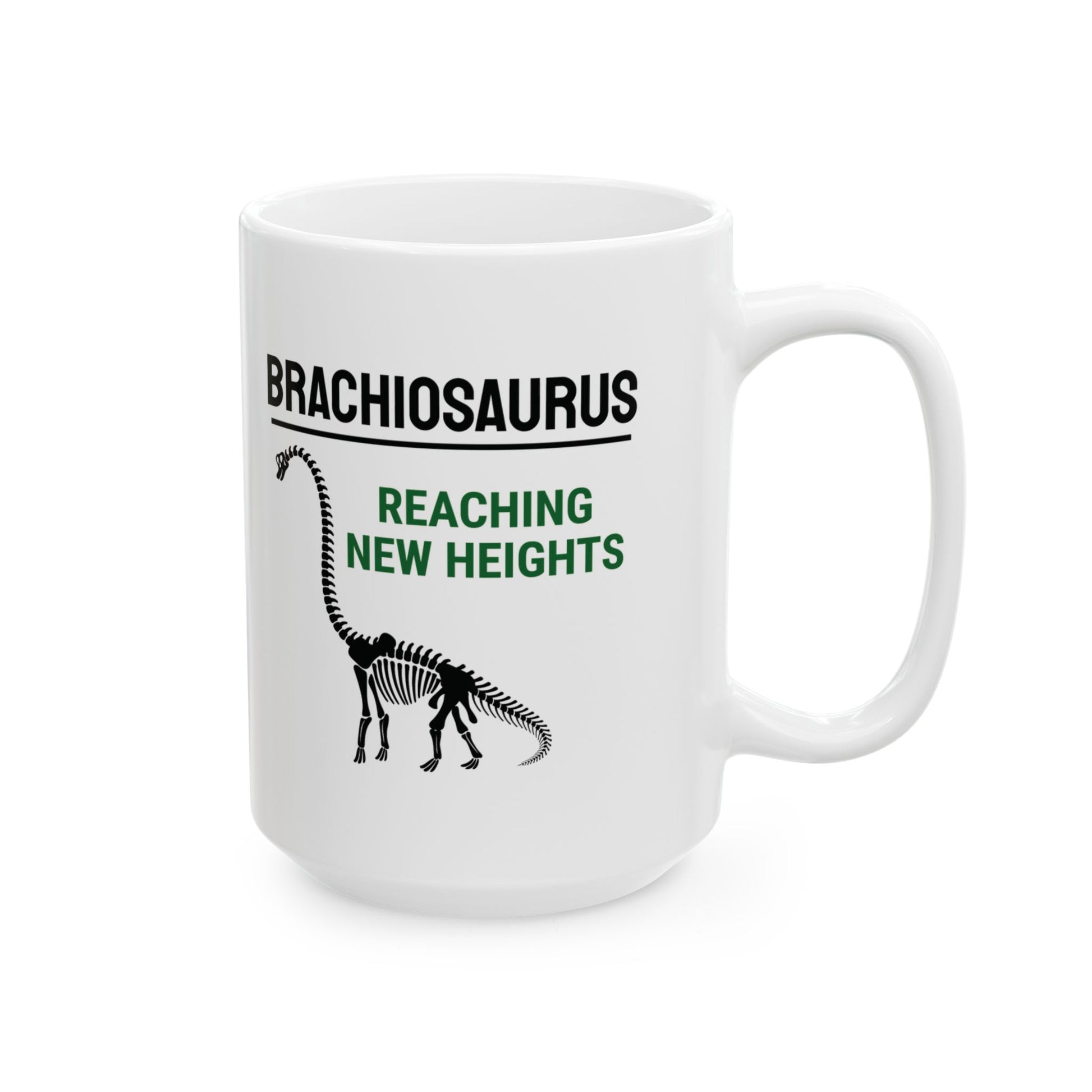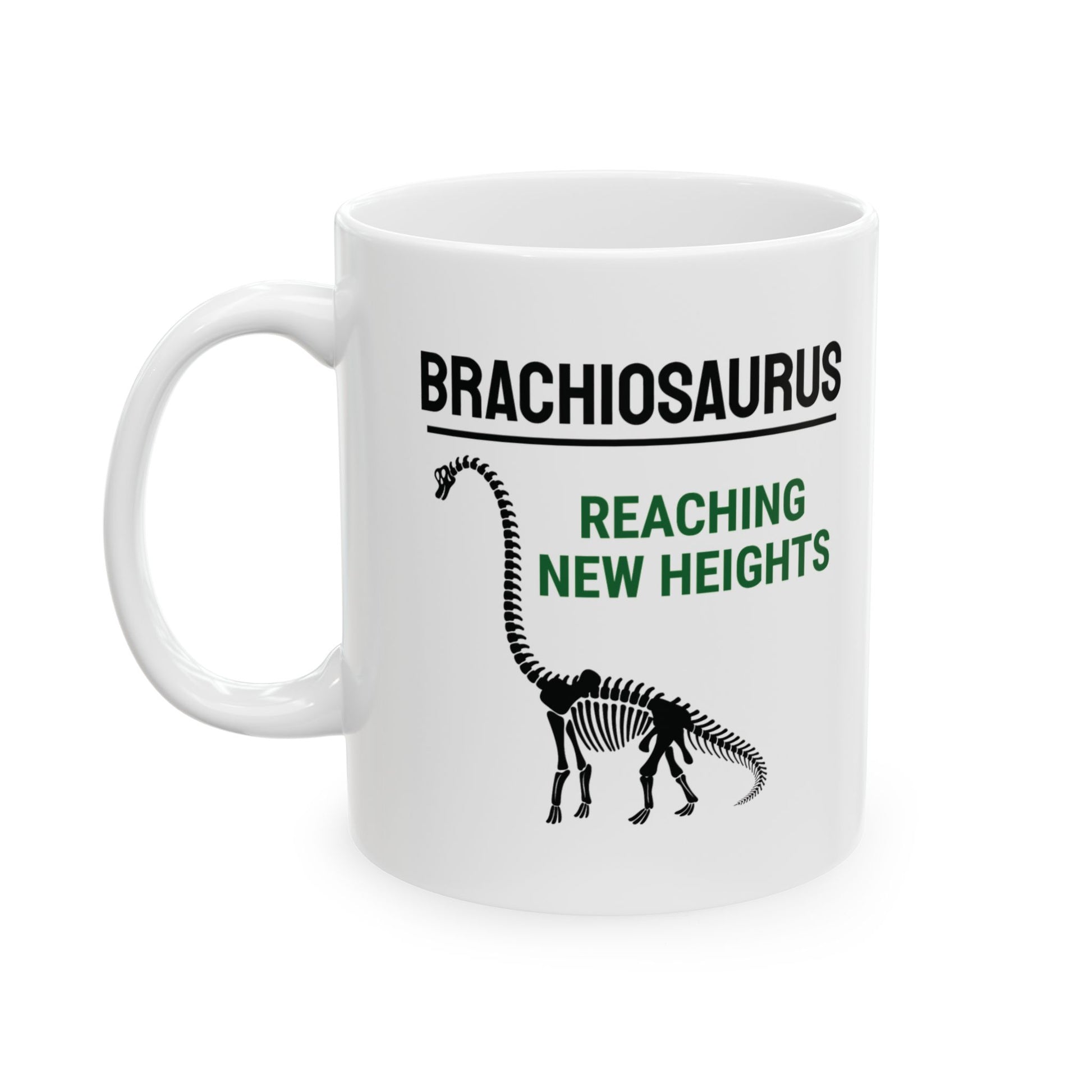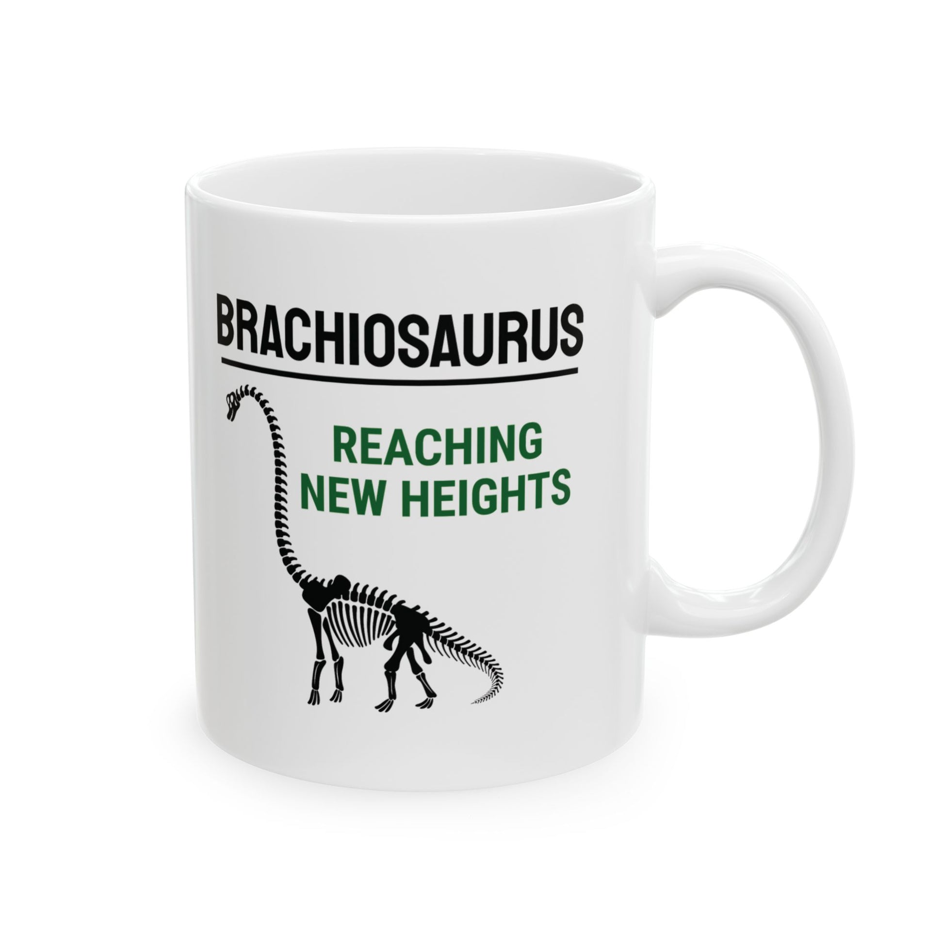 This elegant mug features a striking black and white Brachiosaurus skeleton illustration with the motivational phrase "BRACHIOSAURUS: REACHING NEW HEIGHTS" in bold black and green typography. The design showcases the impressive long-necked silhouette of this massive Jurassic sauropod, emphasizing its towering posture and distinctive anatomy. The minimalist color scheme highlights the detailed vertebrae of the extraordinarily long neck that made this dinosaur one of the tallest creatures to ever walk the Earth. Warm-up with a nice cuppa out of this customized ceramic coffee mug. It’s BPA and Lead-free, microwave & dishwasher-safe, and made of white, durable ceramic in 11-ounce and 15-ounce sizes. Thanks to the advanced printing tech, your designs come to life with incredibly vivid colors – the perfect gift for coffee, tea, and chocolate lovers. .: These mugs are made with durable white ceramic so that your prints can stand out. .: Available in two sizes: 11oz (0.33 l) and 15oz (0.44 l) .: All mugs feature a comfortable C-handle and a shiny finish so that they're both easy to use and great to look at. .: Drink confidently on a daily basis as all mugs are lead and BPA-free.