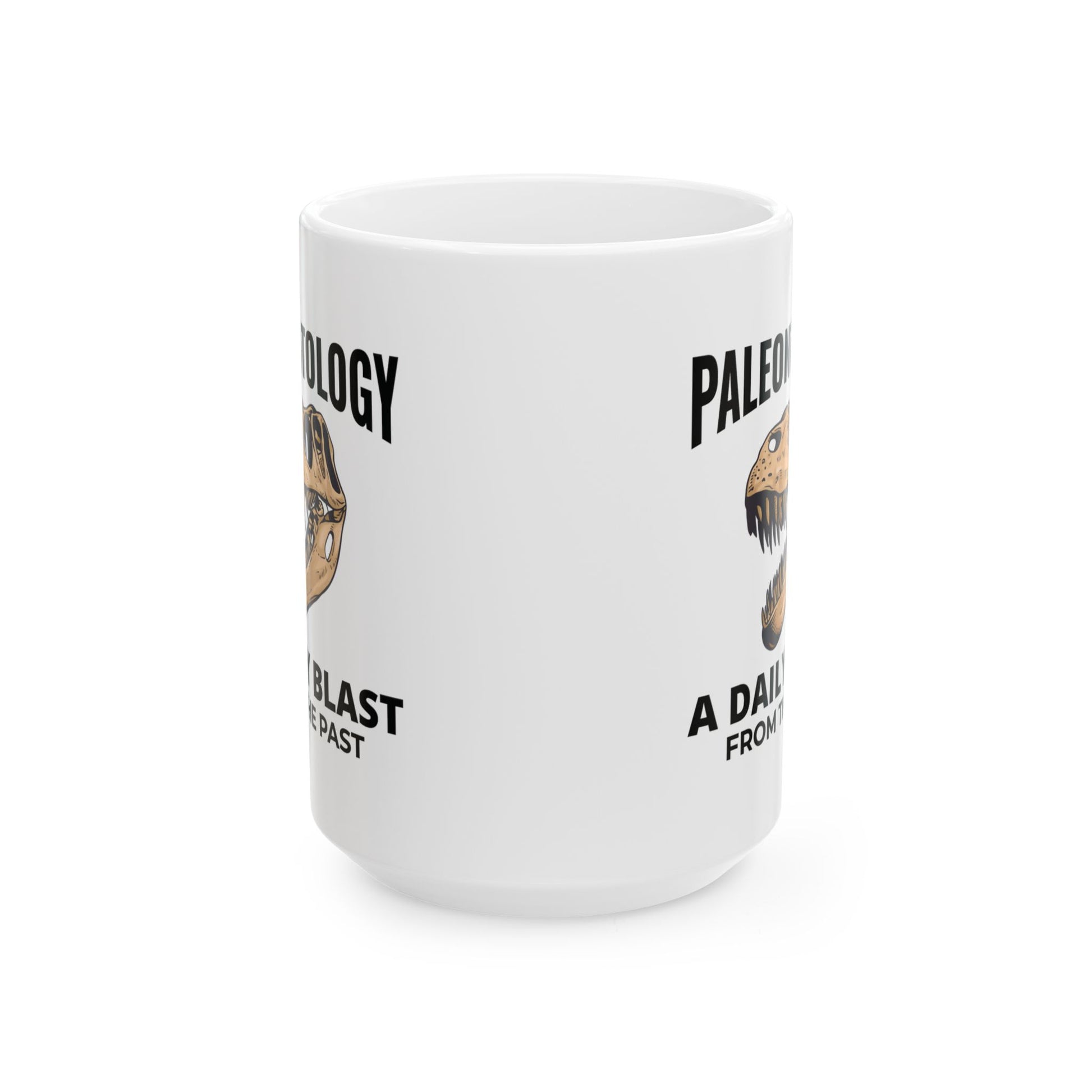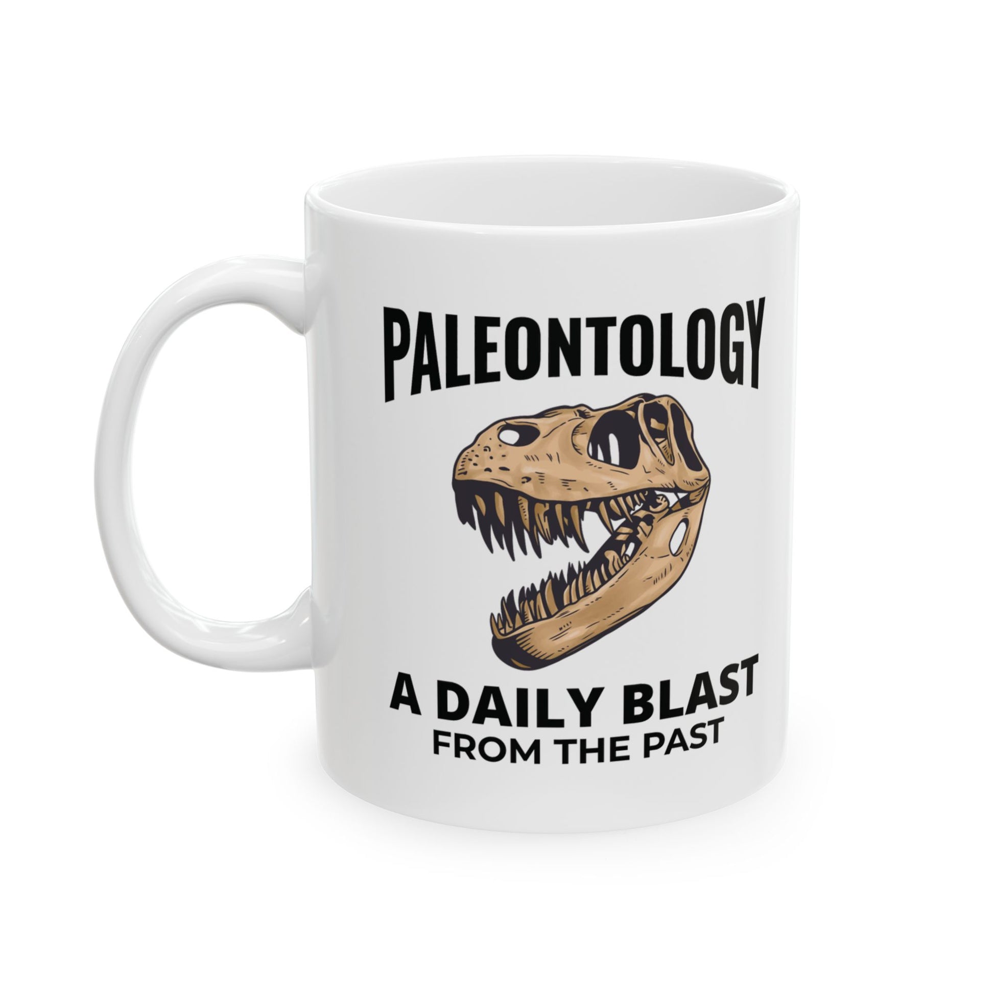Start your morning with "A Daily Blast From The Past" with this eye-catching paleontology-themed mug featuring a detailed T-Rex skull illustration. Perfect for fossil hunters, dinosaur researchers, and anyone passionate about prehistoric life, this mug showcases fossil dinosaurs in a professionally illustrated tan and black fossil style beneath the bold "PALEONTOLOGY" header. Warm-up with a nice cuppa out of this customized ceramic coffee mug. It’s BPA and Lead-free, microwave & dishwasher-safe, and made of white, durable ceramic in 11-ounce and 15-ounce sizes. Thanks to the advanced printing tech, your designs come to life with incredibly vivid colors – the perfect gift for coffee, tea, and chocolate lovers. .: These mugs are made with durable white ceramic so that your prints can stand out. .: Available in two sizes: 11oz (0.33 l) and 15oz (0.44 l) .: All mugs feature a comfortable C-handle and a shiny finish so that they're both easy to use and great to look at. .: Drink confidently on a daily basis as all mugs are lead and BPA-free.