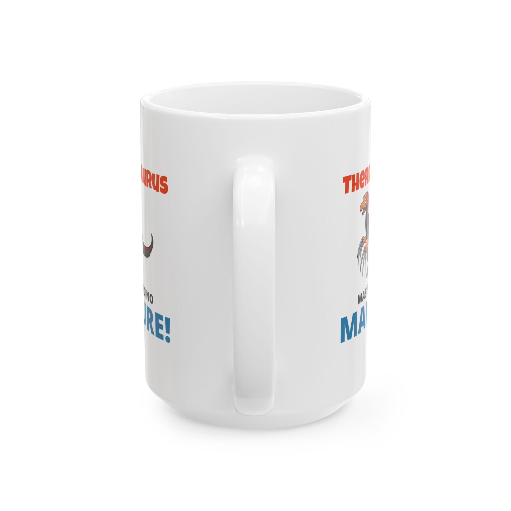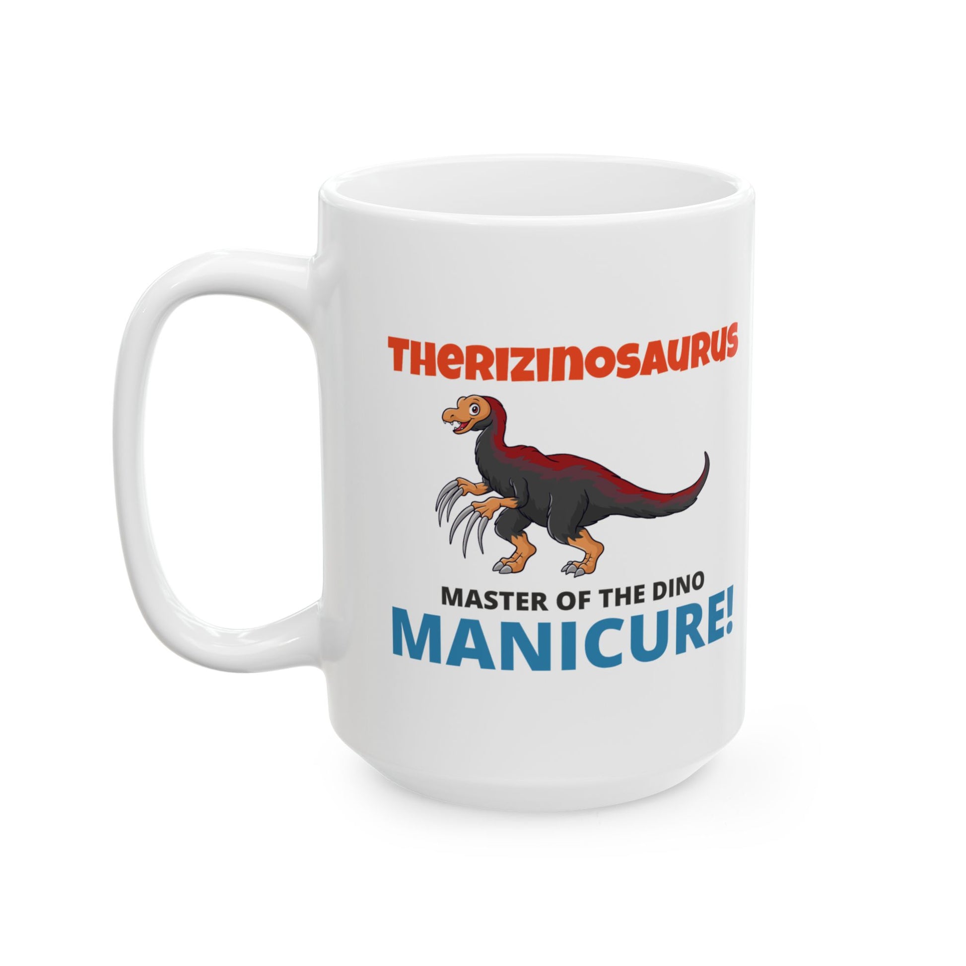 Get a laugh with your morning coffee with this Therizinosaurus Dinosaur Fossil Mug! Featuring a cartoon-style illustration of the Therizinosaurus, known for its comically large claws, this mug playfully declares it the "Master of the Dino Manicure!" This design adds a humorous twist to the prehistoric world, making it a perfect gift for dinosaur enthusiasts with a sense of humor. Enjoy a fun and unique way to celebrate this fascinating dinosaur. Warm-up with a nice cuppa out of this customized ceramic coffee mug. It’s BPA and Lead-free, microwave & dishwasher-safe, and made of white, durable ceramic in 11-ounce and 15-ounce sizes. Thanks to the advanced printing tech, your designs come to life with incredibly vivid colors – the perfect gift for coffee, tea, and chocolate lovers. .: These mugs are made with durable white ceramic so that your prints can stand out. .: Available in two sizes: 11oz (0.33 l) and 15oz (0.44 l) .: All mugs feature a comfortable C-handle and a shiny finish so that they're both easy to use and great to look at. .: Drink confidently on a daily basis as all mugs are lead and BPA-free.