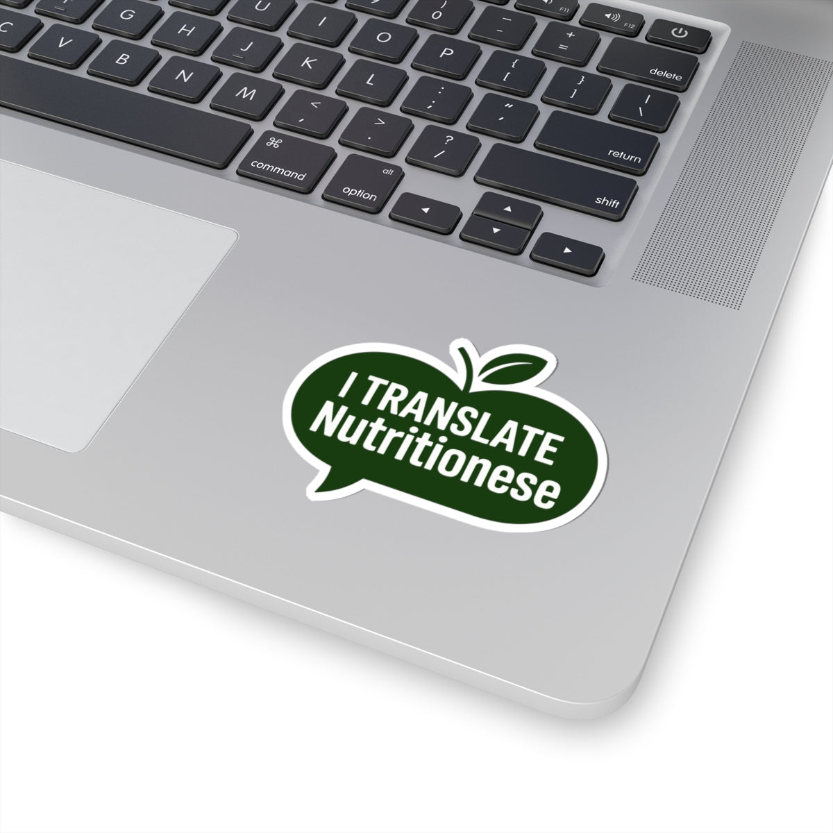 Celebrate your skill in making nutrition science understandable with this "Translate Nutritionese" sticker. Perfect for Registered Dietitians, nutrition communicators, and health educators who bridge the gap between complex science and everyday healthy eating habits. Product features - Glossy paper finish for a scratch-resistant surface - Long-lasting vinyl with a strong adhesive for smooth surfaces - Vibrant colors printed with eco-friendly inks - Quick and easy application, without bubbles - Available in multiple sizes with white and transparent options Care instructions - Use a soft, clean and dry cloth to gently brush any dust or dirt off from the center of the sticker outwards.