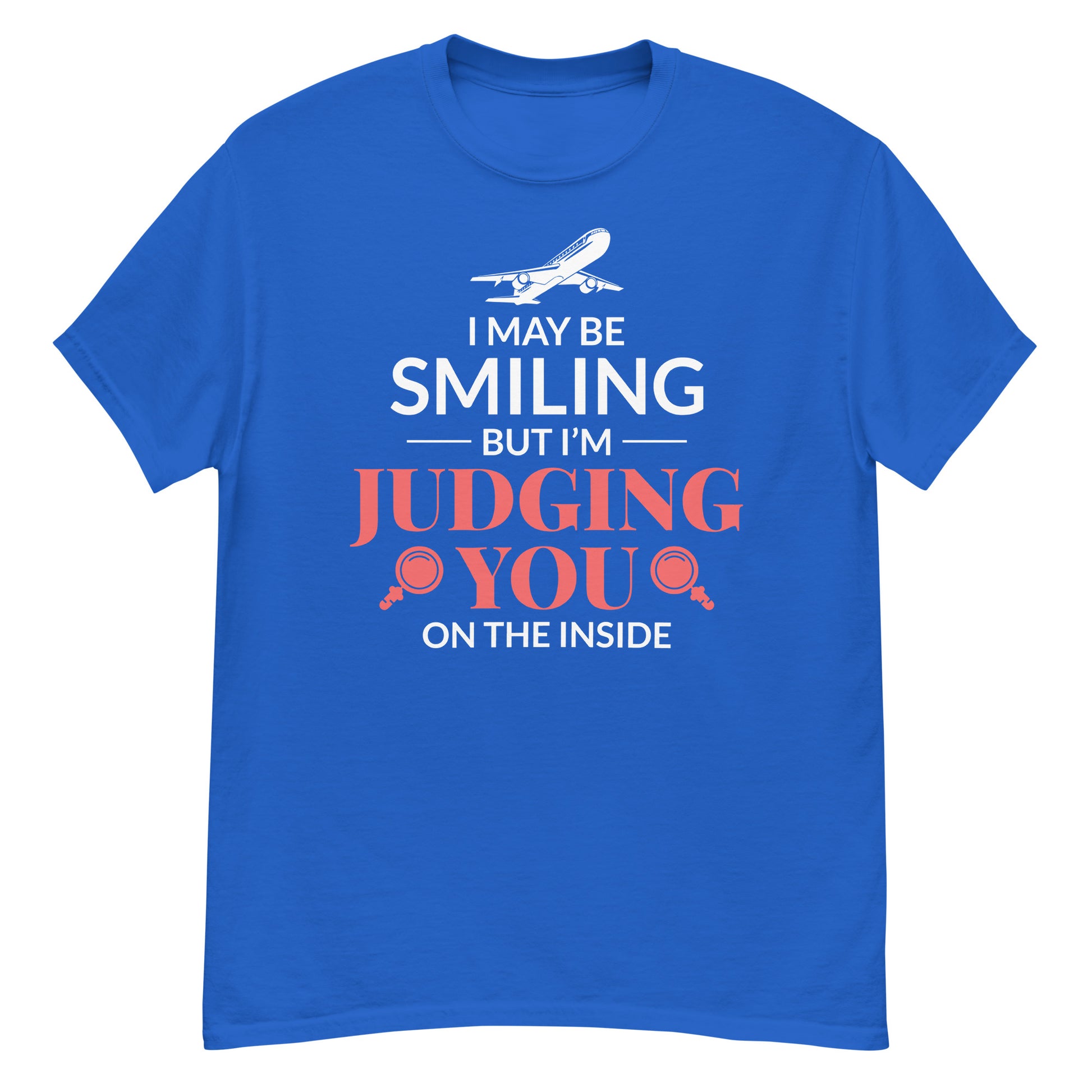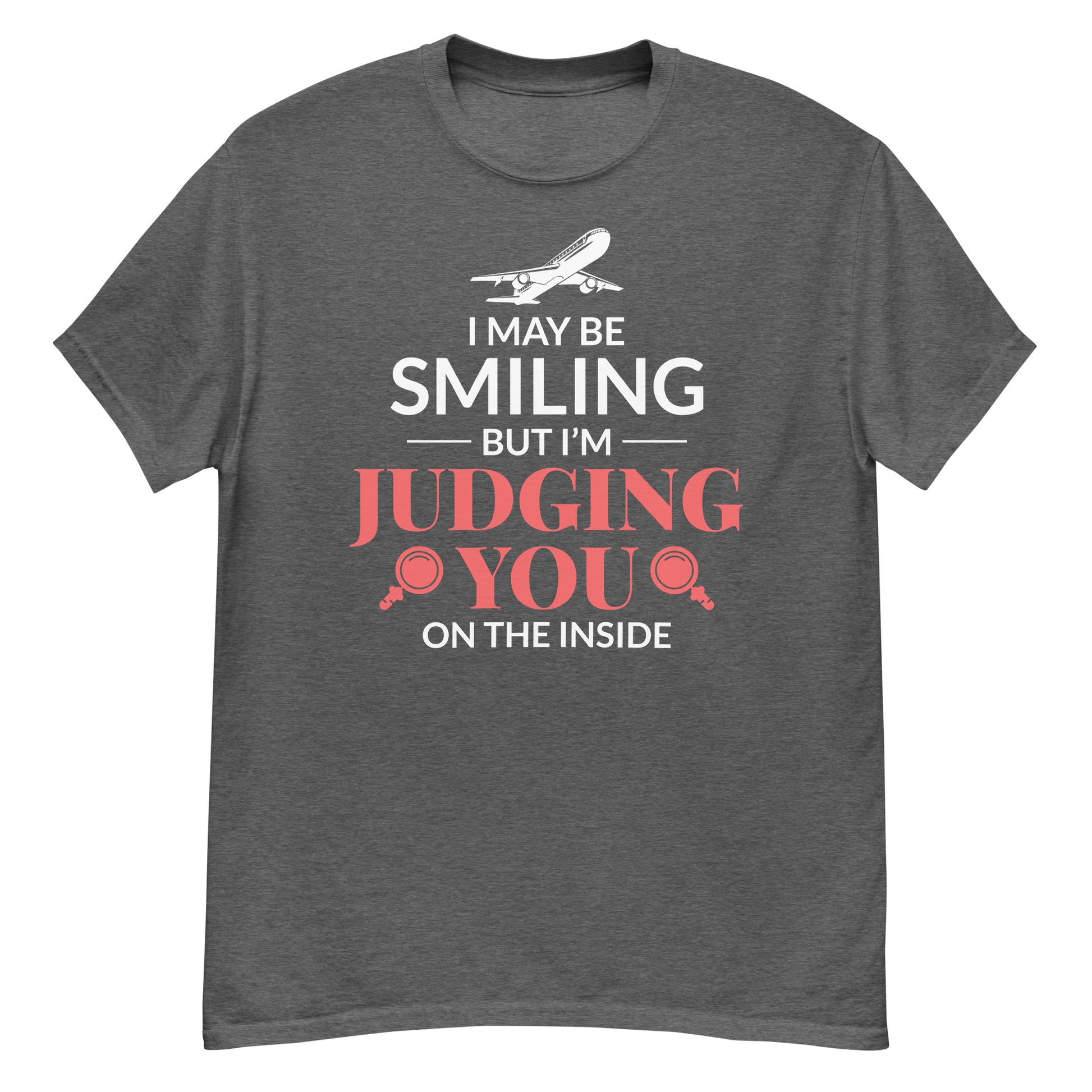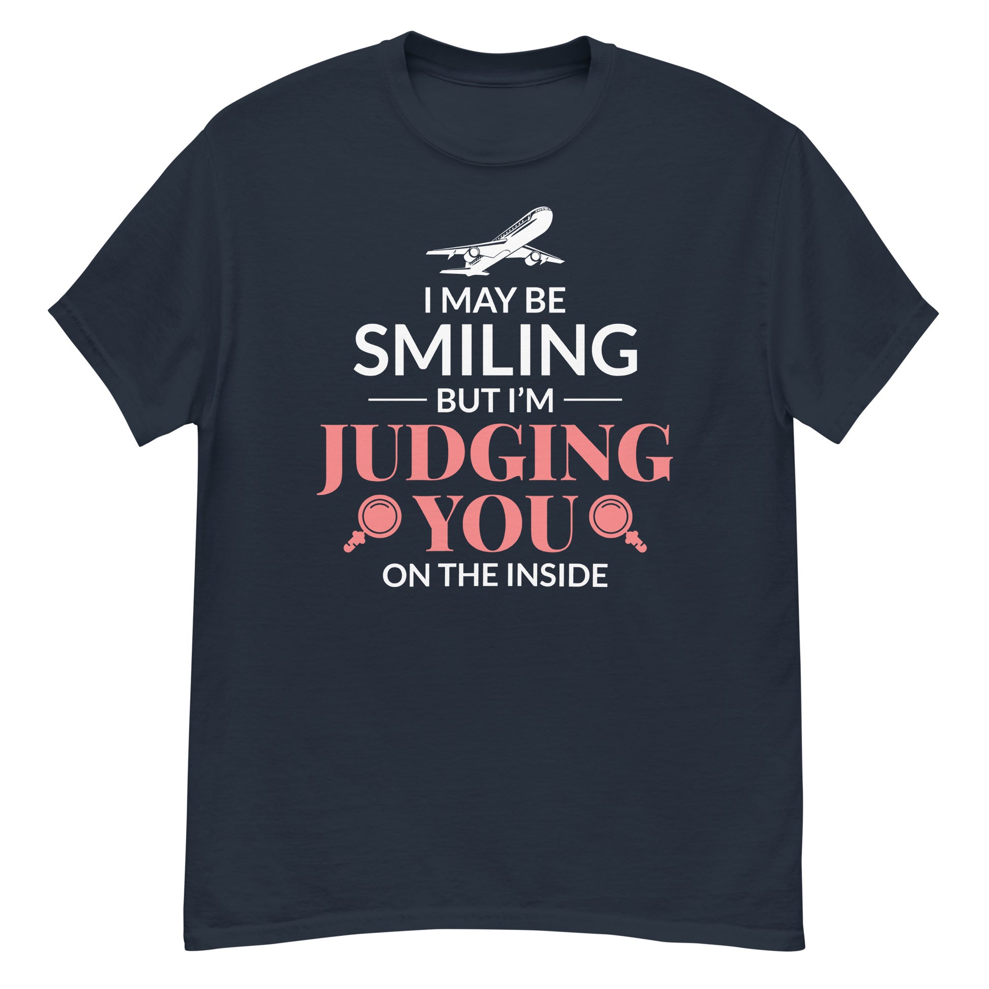 Showcase your flight attendant humor with this witty T-Shirt featuring the phrase "I May Be Smiling, But I'm Judging You on the Inside." Perfect for cabin crew members, aviation enthusiasts, and anyone who appreciates the behind-the-scenes thoughts of in-flight service professionals. This design adds a humorous touch to the essential role of flight attendants.
