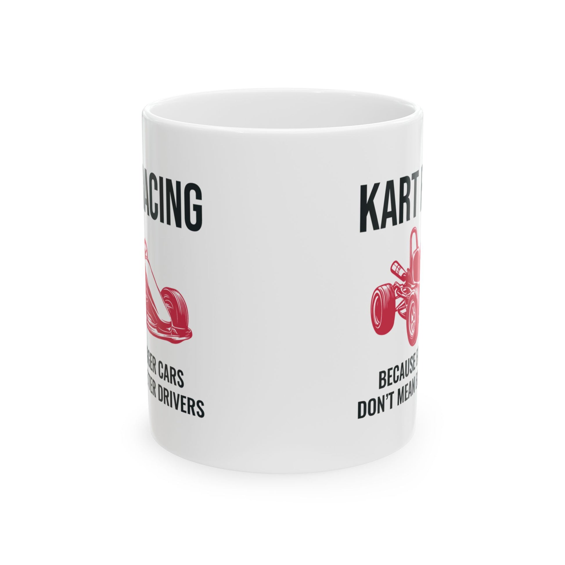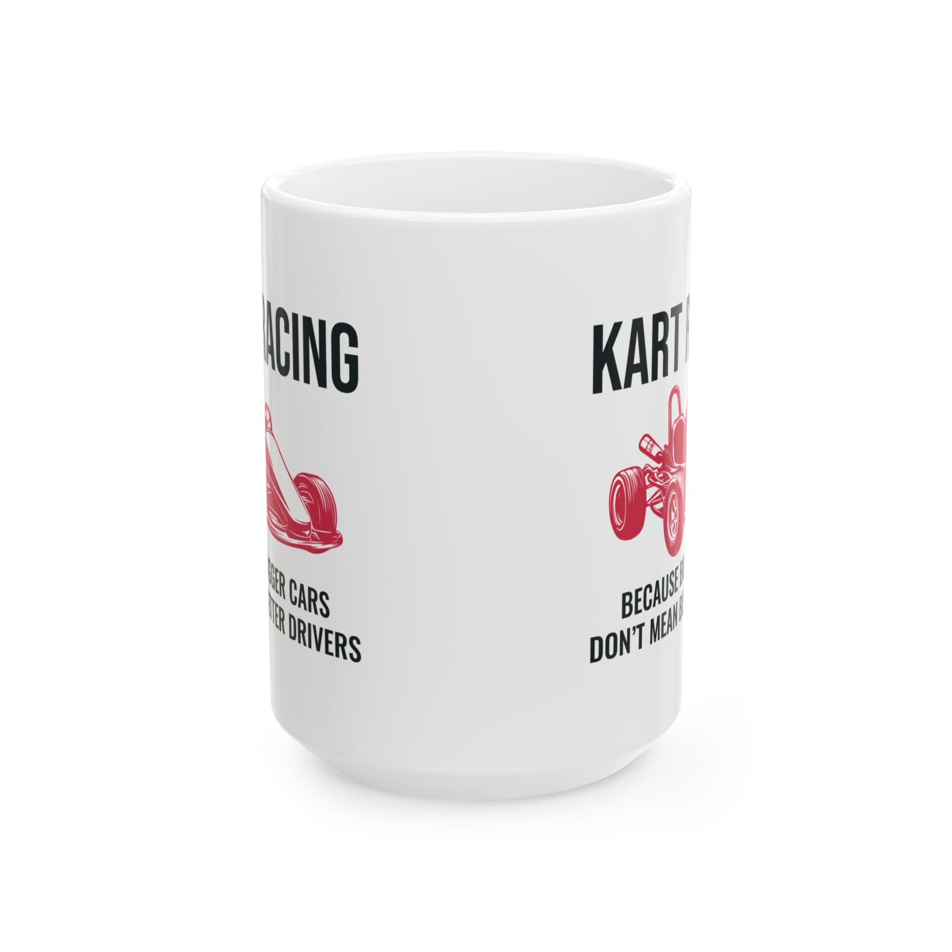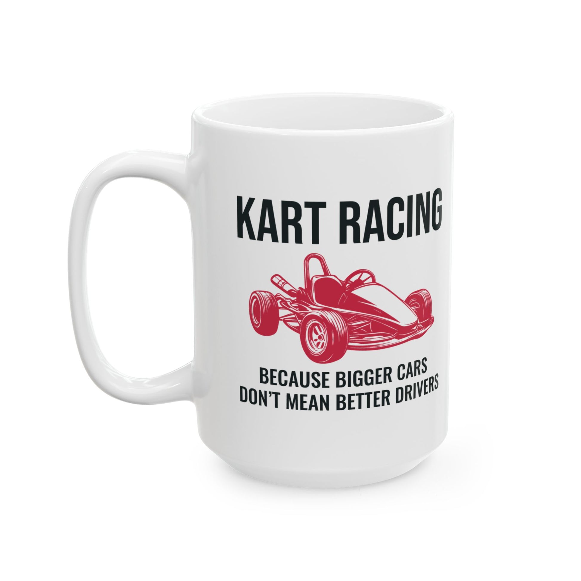 This eye-catching Go Kart Racing mug features a bold red racing kart design with a humorous message about driving skill. The classic racing vehicle illustration makes this the perfect drinkware for karting enthusiasts, motorsport competitors, and race lovers who appreciate that skill matters more than vehicle size.
