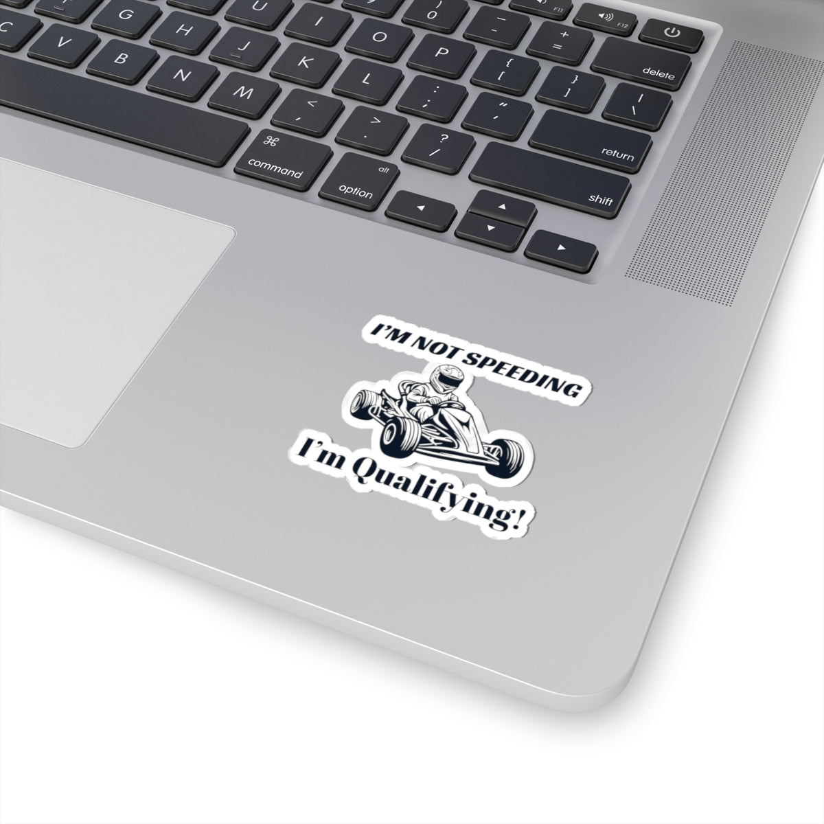 Funny Go Kart Racing vinyl sticker with "I'm Not Speeding, I'm Qualifying" design. Perfect for helmets, cars, and racing gear. Durable and weatherproof.