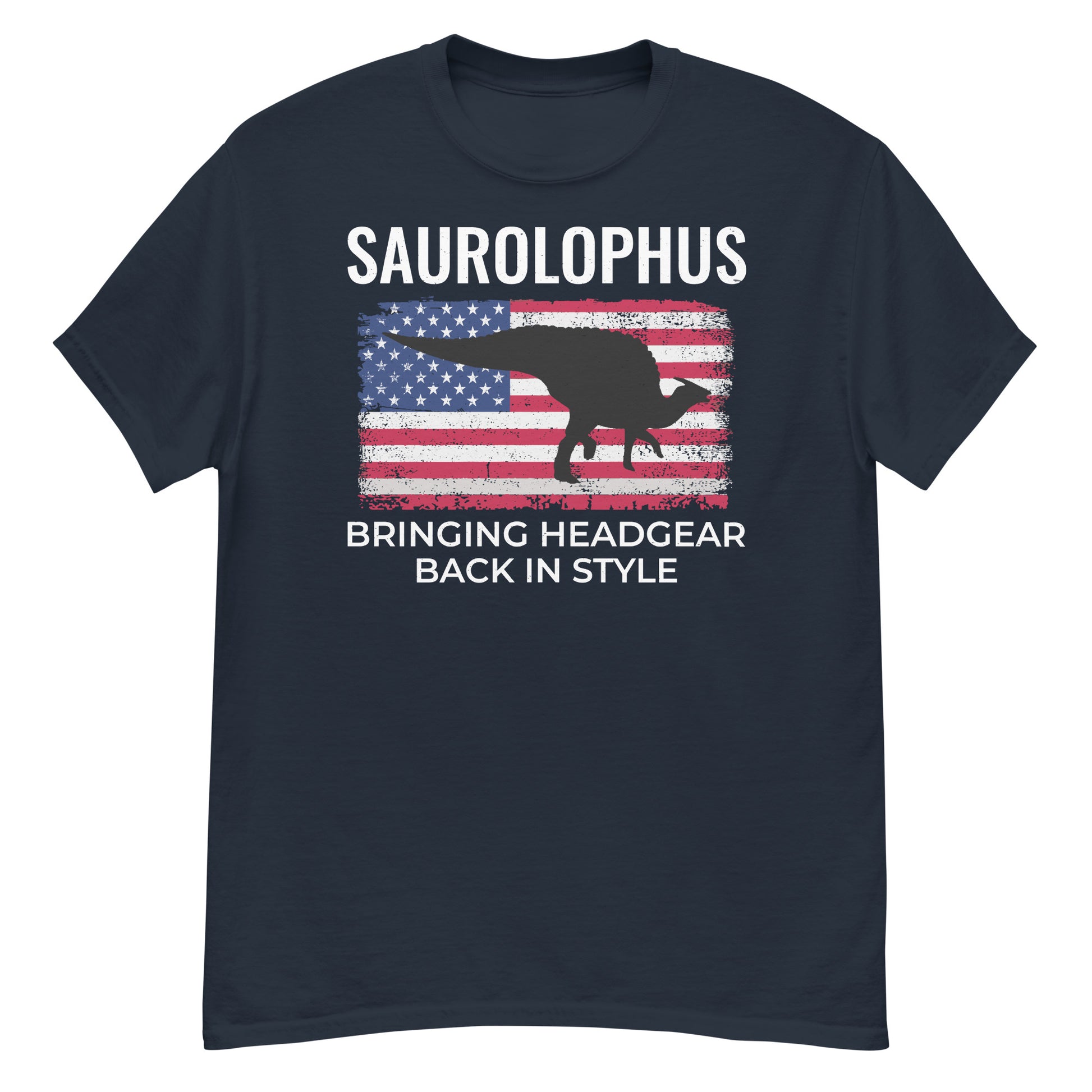 Celebrate your love for dinosaurs and American pride with this unique Saurolophus T-Shirt. Featuring the crest-toting Saurolophus with a patriotic twist, it's perfect for anyone who appreciates classic headgear and prehistoric fashion.