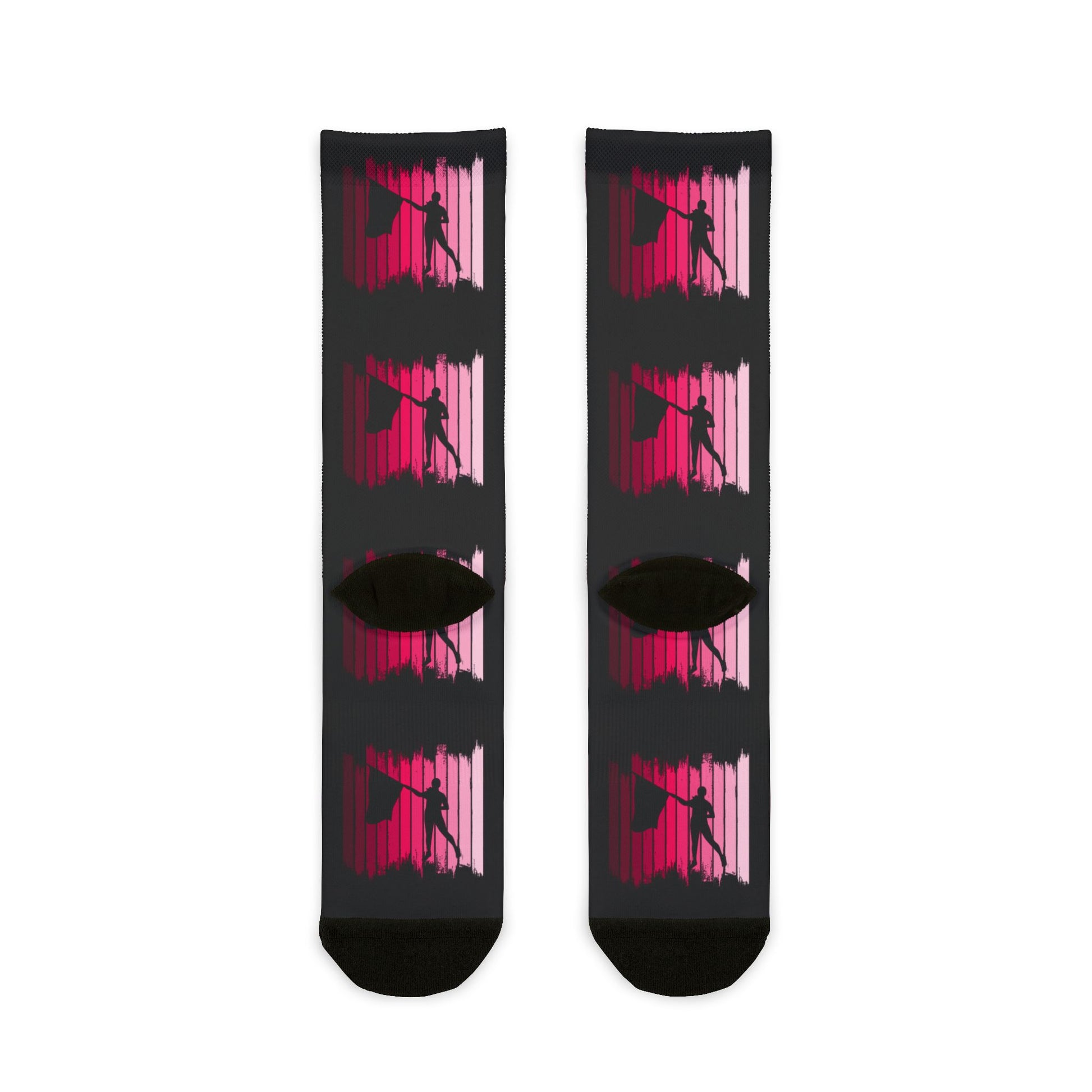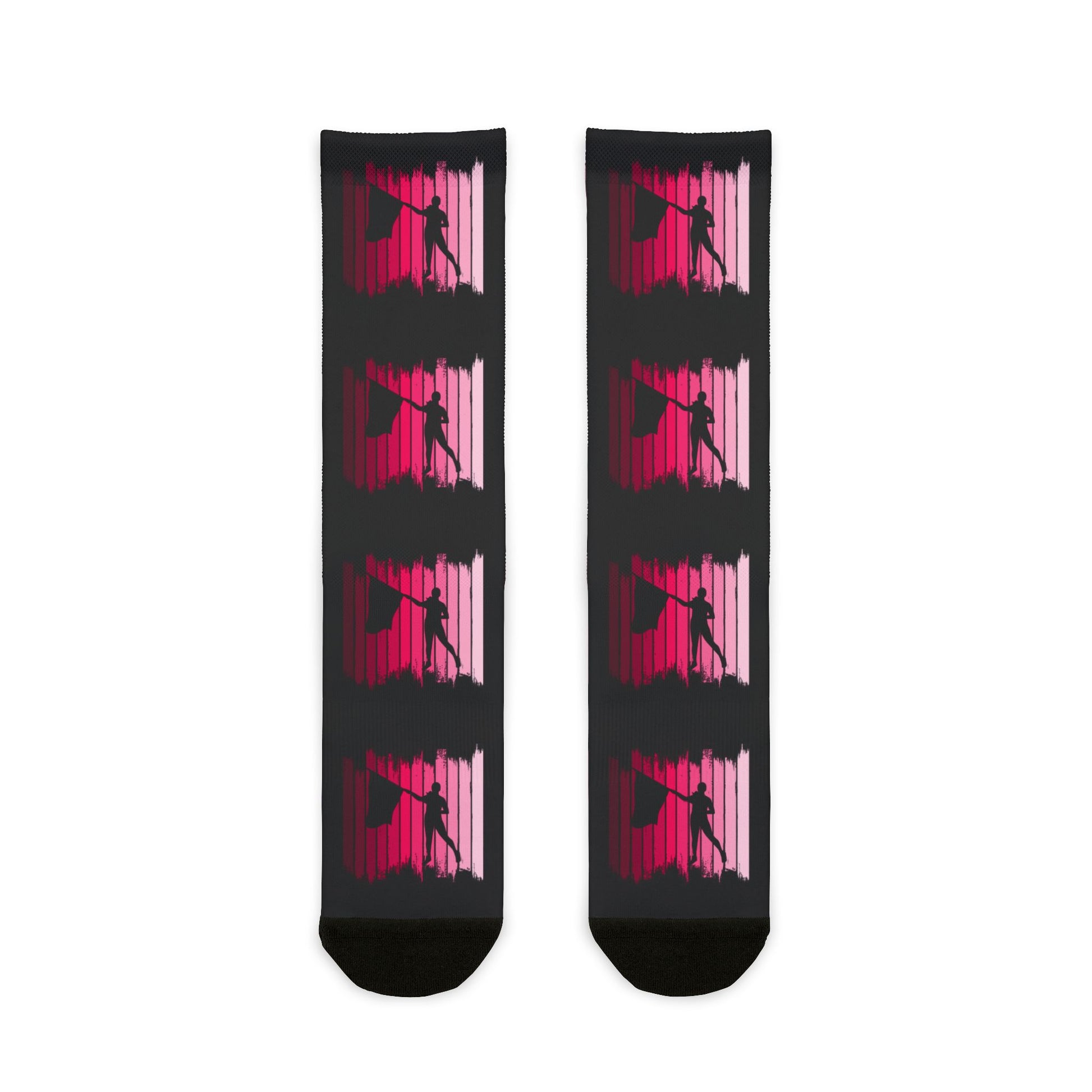 Step up your Color Guard style with these eye-catching socks featuring a bold silhouette design of a flag performer against a vibrant pink gradient background. Perfect for performers, fans, and proud supporters, these socks highlight the passion and artistry of Color Guard. Add a dynamic touch to your wardrobe and showcase your love for the sport wherever you go.