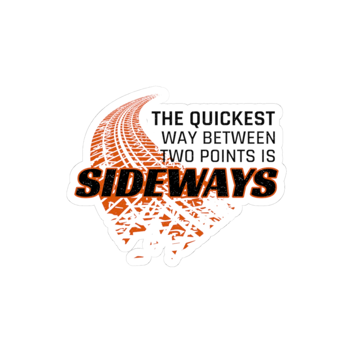 This bold drift racing sticker showcases the philosophy of going sideways with an eye-catching tire track design in vibrant orange. The clever phrase "The quickest way between two points is SIDEWAYS" perfectly captures the essence and technique of drift motorsport.