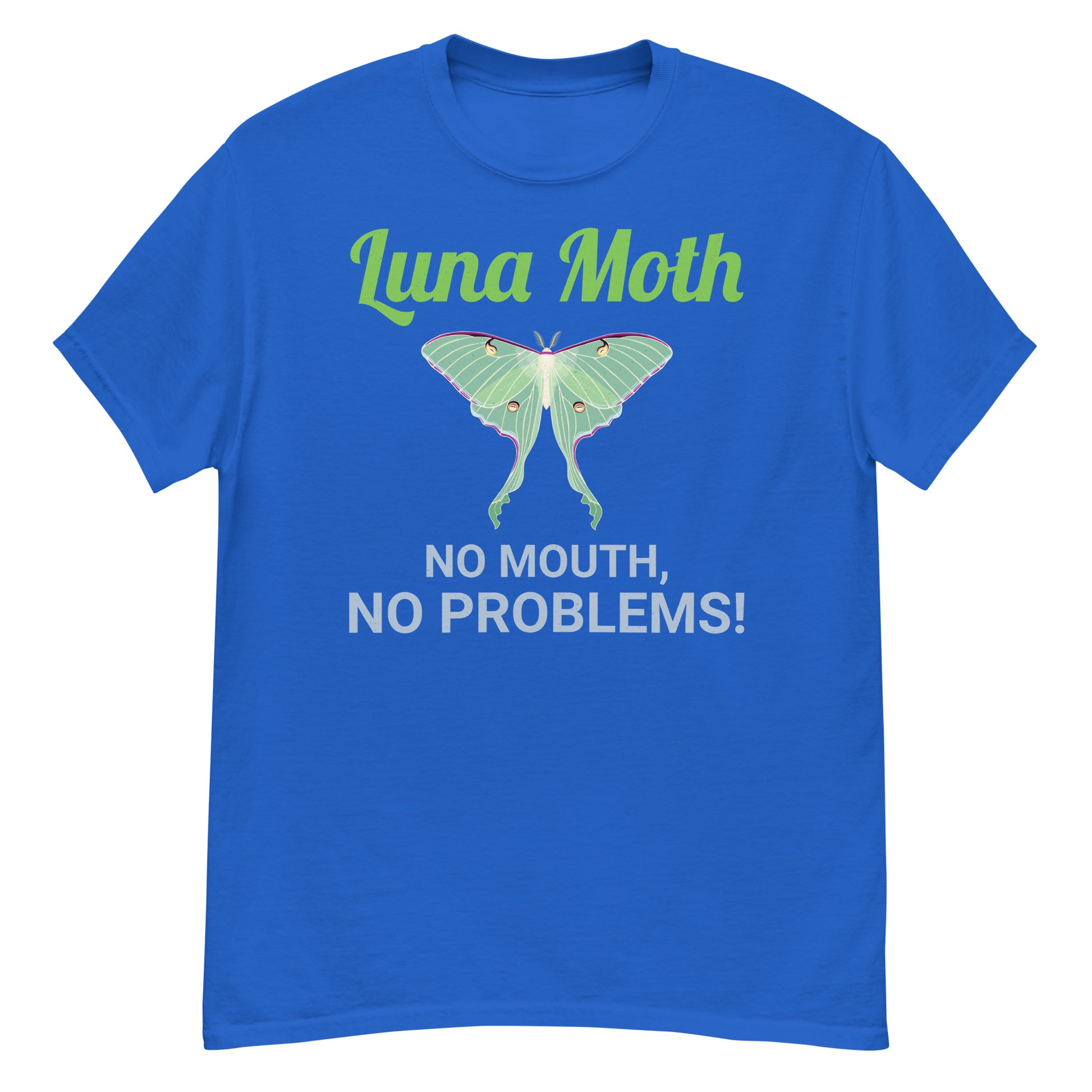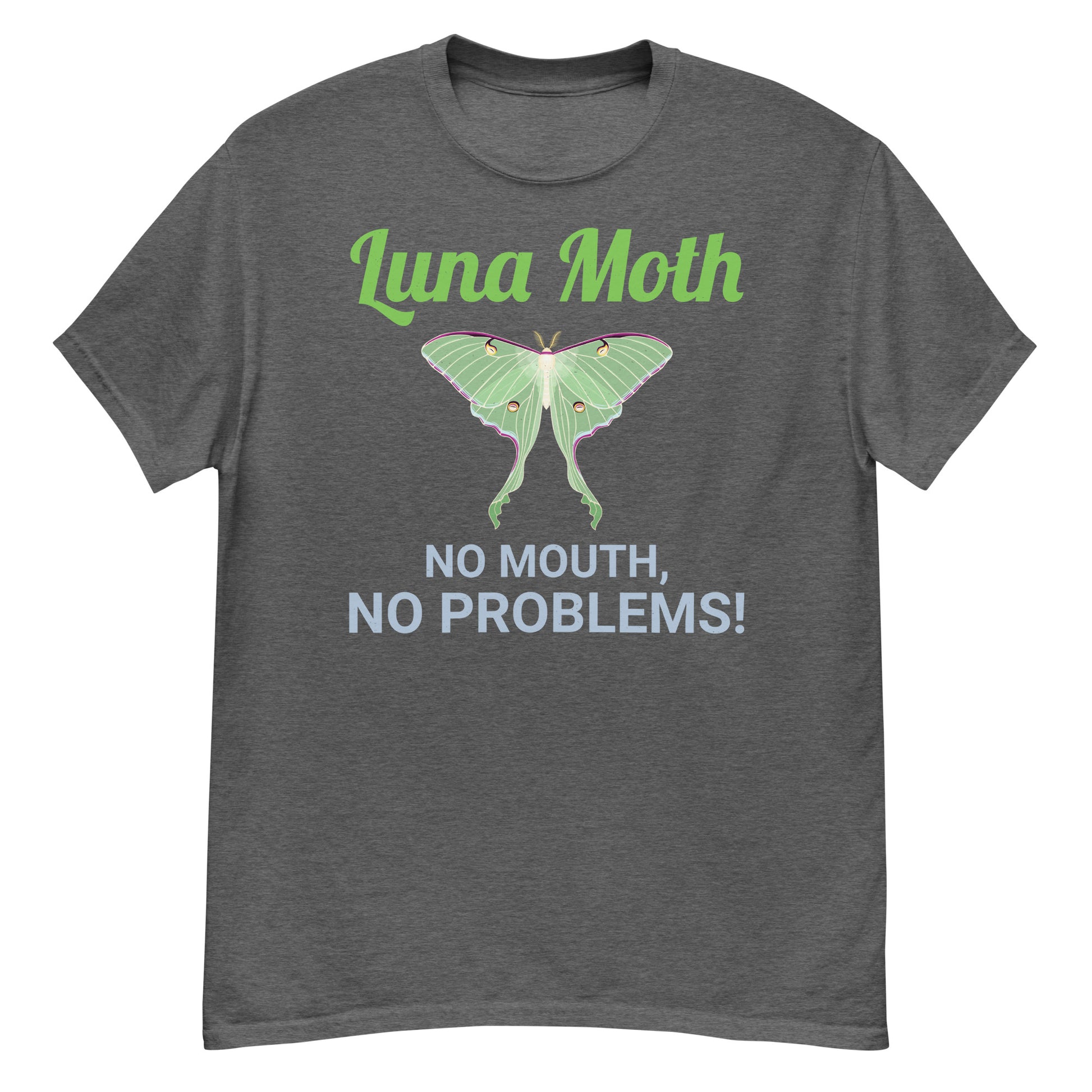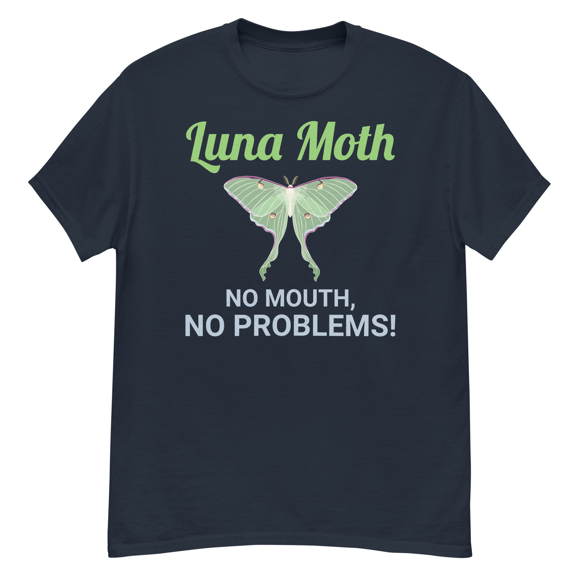 Celebrate the unique beauty of the Luna Moth with the "Luna Moth: No Mouth, No Problems" T-shirt. Perfect for moth enthusiasts and insect collectors, this playful design highlights the fascinating nature of the Luna Moth's short yet stunning life.