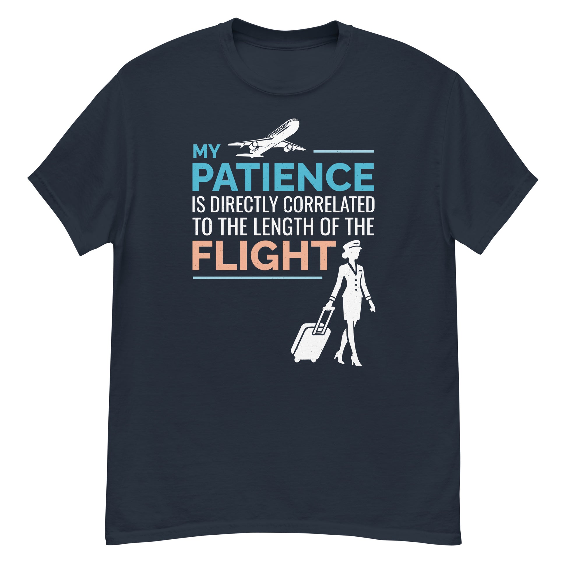 Showcase your understanding of the demanding life of a flight attendant with this witty T-Shirt featuring the phrase "My Patience is Directly Correlated to the Length of the Flight." Perfect for cabin crew members, aviation enthusiasts, and anyone who appreciates the humor in the challenges of air travel. This design humorously highlights the patience required in the aviation profession.
