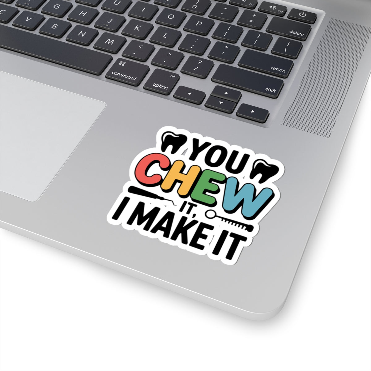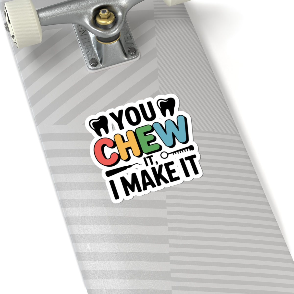 Celebrate the cycle of dental restoration with this witty "You Chew It, I Make It" lab sticker. Perfect for denture technicians, crown specialists, and prosthodontic professionals, this decal adds humor to your workstation while honoring the vital repair work of dental labs.